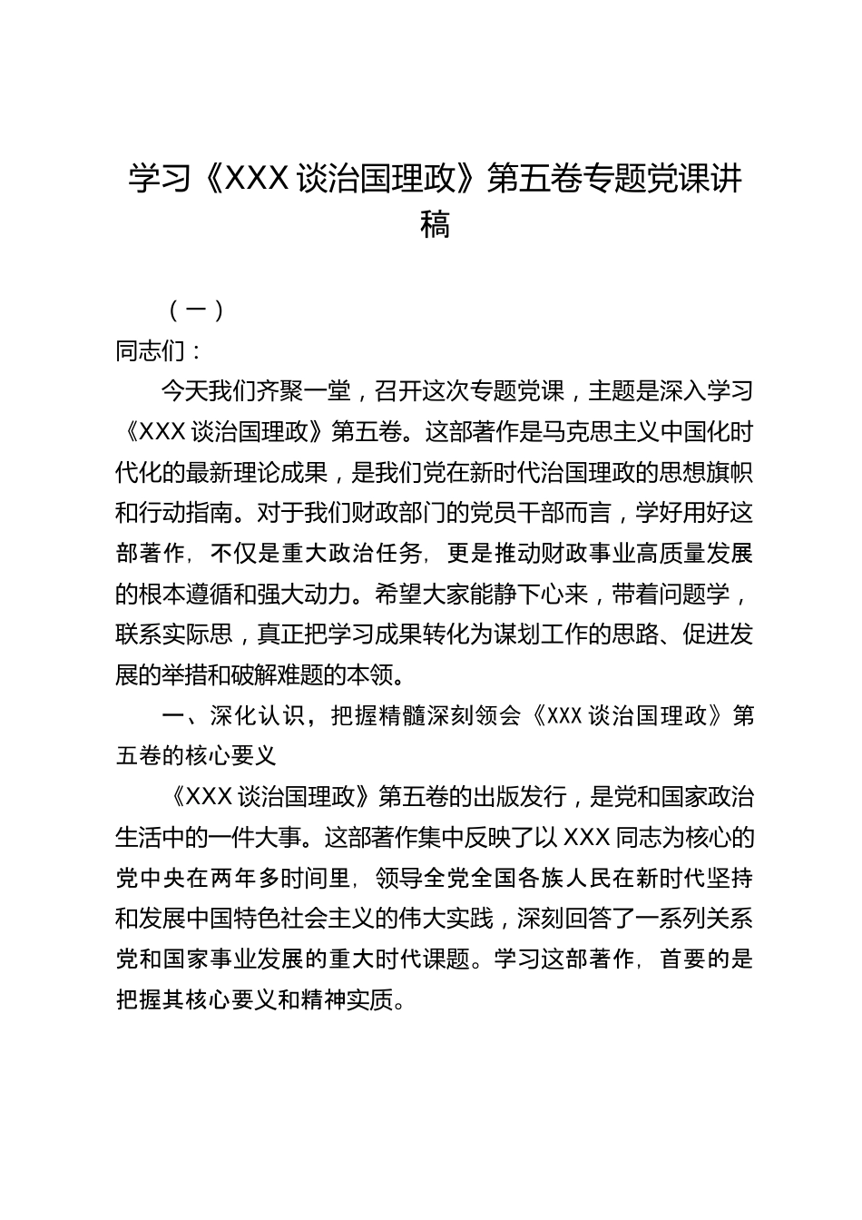 學(xué)習(xí)《XXX談治國理政》第五卷專題黨課講稿(一)同志們:今天我們齊聚一堂,召開這次專題黨課,主題是深入學(xué)習(xí)《XXX談治國理政》第五卷。這部著作是馬克思主義中國化時(shí)代化的最新理論成果,是我們黨在新時(shí)代治國理政的思想旗幟和行動(dòng)指南。對于我們財(cái)政部門的黨員干部而言,學(xué)好用好這部著作,不是重大政治任,更是推政事高量展僅務(wù)動(dòng)財(cái)業(yè)質(zhì)發(fā)的根本遵循和強(qiáng)大動(dòng)力。希望大家能靜下心來,帶著問題學(xué),聯(lián)系實(shí)際思,真正把學(xué)習(xí)成果轉(zhuǎn)化為謀劃工作的思路、促進(jìn)發(fā)展的舉措和破解難題的本領(lǐng)。一、深化認(rèn)識(shí),把握精髓深刻領(lǐng)會(huì)《XXX談治國理政》第五卷的核心要義《XXX談治國理政...
