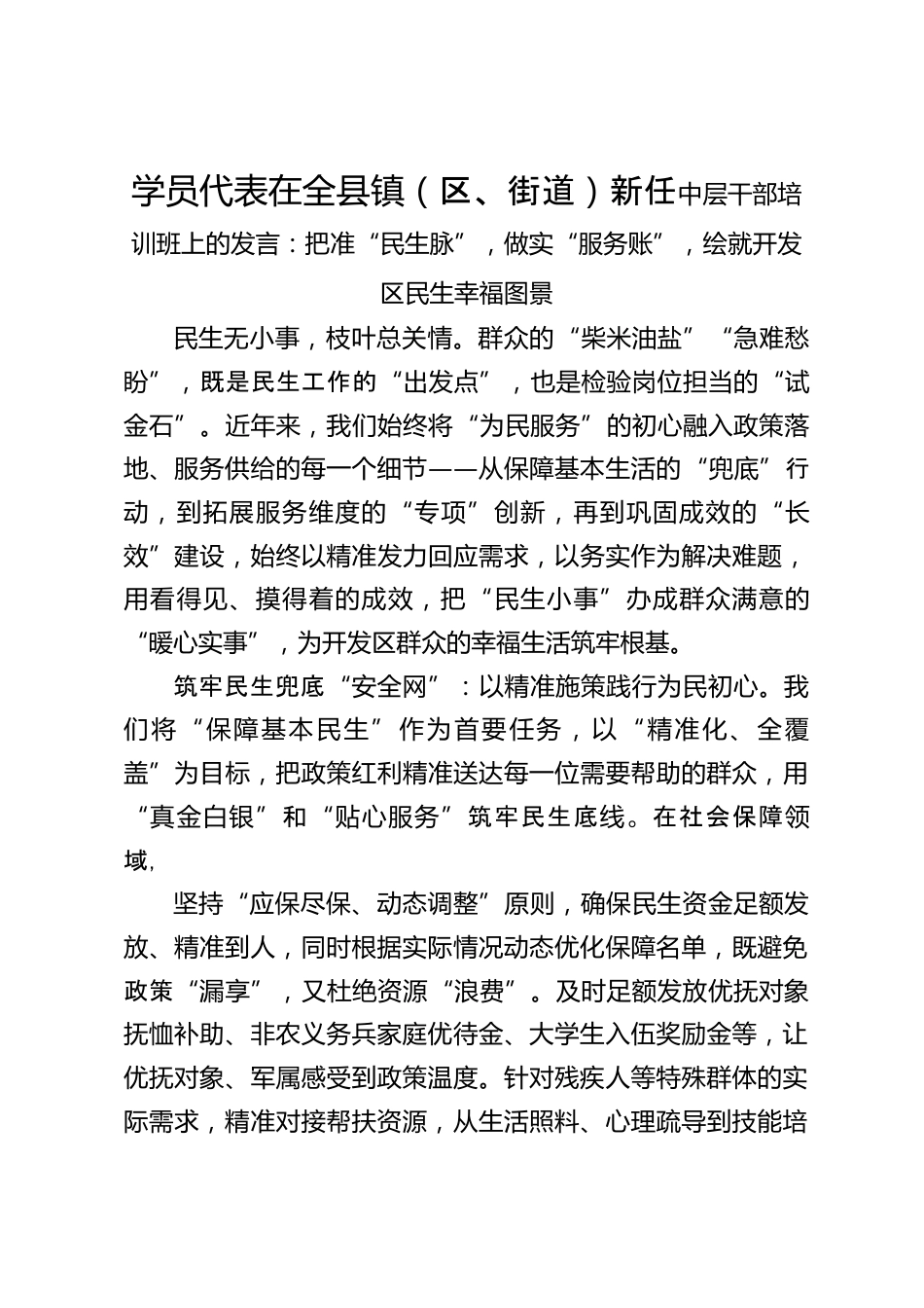 學(xué)員代表在全縣鎮(zhèn)(區(qū)、街道)新任中層干部培訓(xùn)班上的發(fā)言:把準(zhǔn)“民生脈”,做實(shí)“服務(wù)賬”,繪就開(kāi)發(fā)區(qū)民生幸福圖景
