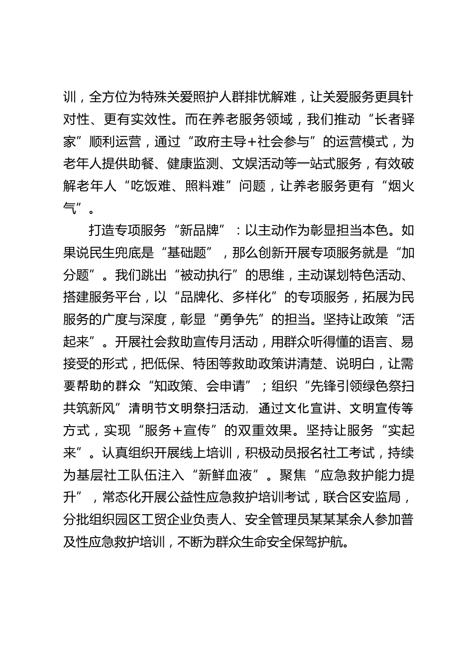 學(xué)員代表在全縣鎮(zhèn)(區(qū)、街道)新任中層干部培訓(xùn)班上的發(fā)言:把準(zhǔn)“民生脈”,做實(shí)“服務(wù)賬”,繪就開(kāi)發(fā)區(qū)民生幸福圖景民生無(wú)小事,枝葉總關(guān)情。群眾的“柴米油鹽”“急難愁盼”,既是民生工作的“出發(fā)點(diǎn)”,也是檢驗(yàn)崗位擔(dān)當(dāng)?shù)摹霸嚱鹗?。近年?lái),我們始終將“為民服務(wù)”的初心融入政策落地、服務(wù)供給的每一個(gè)細(xì)節(jié)——從保障基本生活的“兜底”行動(dòng),到拓展服務(wù)維度的“專項(xiàng)”創(chuàng)新,再到鞏固成效的“長(zhǎng)效”建設(shè),始終以精準(zhǔn)發(fā)力回應(yīng)需求,以務(wù)實(shí)作為解決難題,用看得見(jiàn)、摸得著的成效,把“民生小事”辦成群眾滿意的“暖心實(shí)事”,為開(kāi)發(fā)區(qū)群眾的幸福生活筑牢根基。筑牢...
