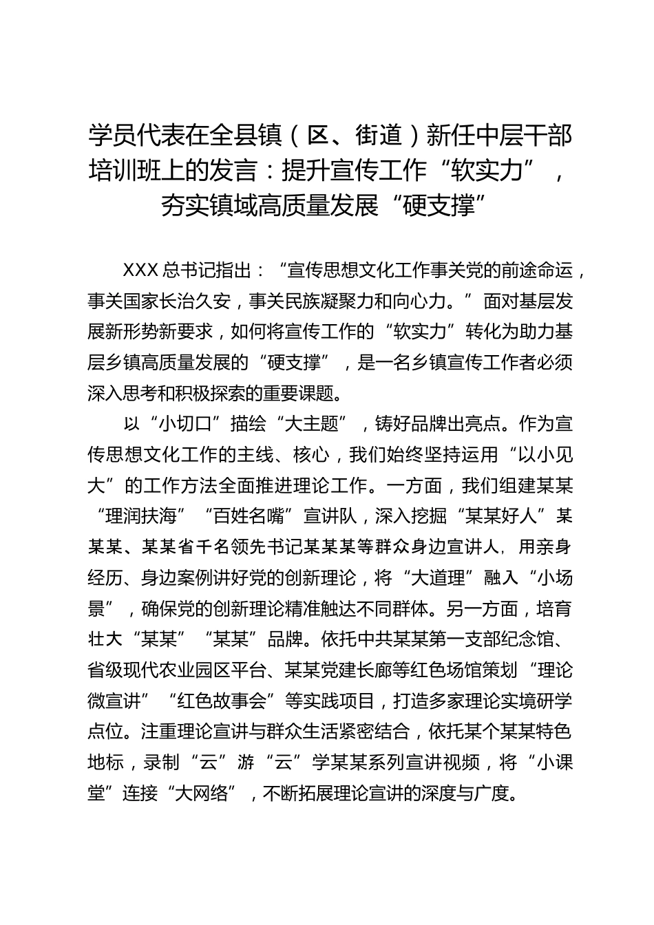 學(xué)員代表在全縣鎮(zhèn)(區(qū)、街道)新任中層干部培訓(xùn)班上的發(fā)言:提升宣傳工作“軟實(shí)力”,夯實(shí)鎮(zhèn)域高質(zhì)量發(fā)展“硬支撐”