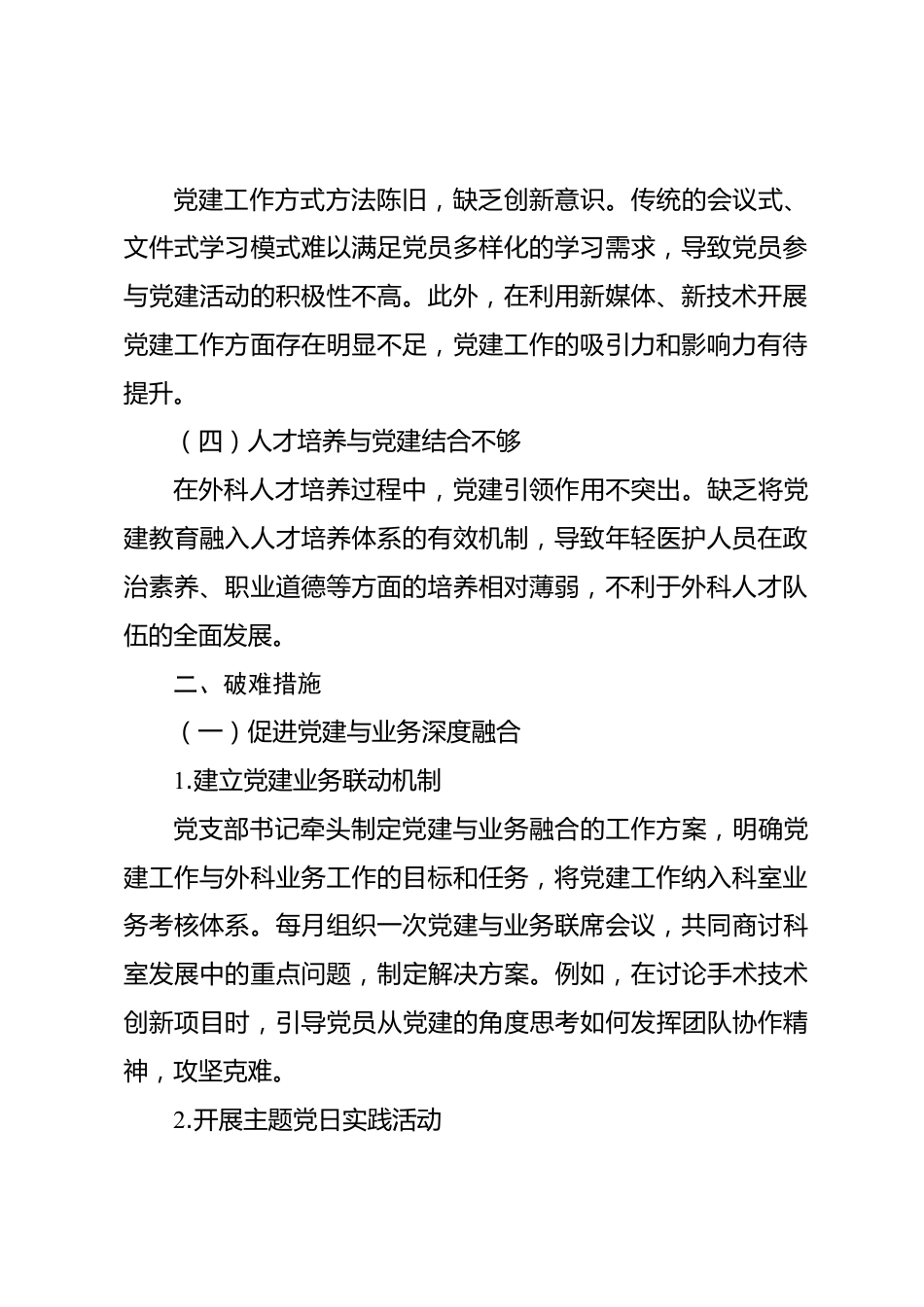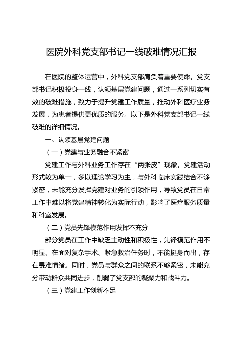 醫(yī)院外科黨支部書記一線破難情況匯報(bào)在醫(yī)院的整體運(yùn)營(yíng)中,外科黨支部肩負(fù)著重要使命。黨支部書記積極投身一線,認(rèn)領(lǐng)基層黨建問(wèn)題,通過(guò)一系列切實(shí)有效的破難措施,致力于提升黨建工作質(zhì)量,推動(dòng)外科醫(yī)療業(yè)務(wù)發(fā)展,為患者提供更優(yōu)質(zhì)的服務(wù)。以下是外科黨支部書記一線破難的詳細(xì)情況。一、認(rèn)領(lǐng)基層黨建問(wèn)題(一)黨建與業(yè)務(wù)融合不緊密黨建工作與外科業(yè)務(wù)工作存在“兩張皮”現(xiàn)象。黨建活動(dòng)形式較為單一,多以理論學(xué)習(xí)為主,與外科臨床實(shí)踐結(jié)合不夠緊密,未能充分發(fā)揮黨建對(duì)業(yè)務(wù)的引領(lǐng)作用,導(dǎo)致黨員在日常工作中難以將黨建精神轉(zhuǎn)化為實(shí)際行動(dòng),影響了醫(yī)療服務(wù)質(zhì)量和科室發(fā)展...