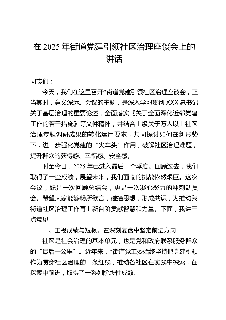 在2025年街道黨建引領(lǐng)社區(qū)治理座談會(huì)上的講話同志們:今天,我們?cè)谶@里召開*街道黨建引領(lǐng)社區(qū)治理座談會(huì),正當(dāng)其時(shí),意義深遠(yuǎn)。會(huì)議的主題,是深入學(xué)習(xí)貫徹XXX總書記關(guān)于基層治理的重要論述,全面落實(shí)《關(guān)于全面深化近鄰黨建工作的若干措施》等文件精神,并結(jié)合上級(jí)關(guān)于萬人以上社區(qū)治理專題調(diào)研成果的轉(zhuǎn)化運(yùn)用要求,共同探討如何在新形勢(shì)下,進(jìn)一步強(qiáng)化黨建的“火車頭”作用,破解社區(qū)治理難題,提升群眾的獲得感、幸福感、安全感。時(shí)至今日,2025年已進(jìn)入最后一個(gè)季度。回顧過去,我們?nèi)〉昧艘恍┏煽?;展望未來,我們面臨的挑戰(zhàn)依然艱巨。這次會(huì)議,既是一次回顧總結(jié)會(huì)...