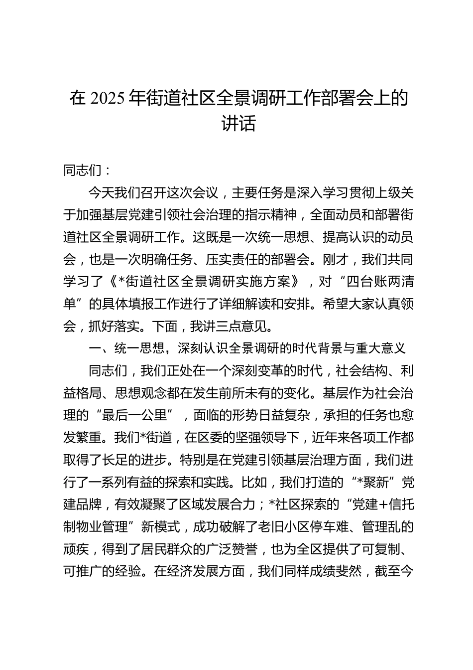 在2025年街道社區(qū)全景調(diào)研工作部署會上的講話
