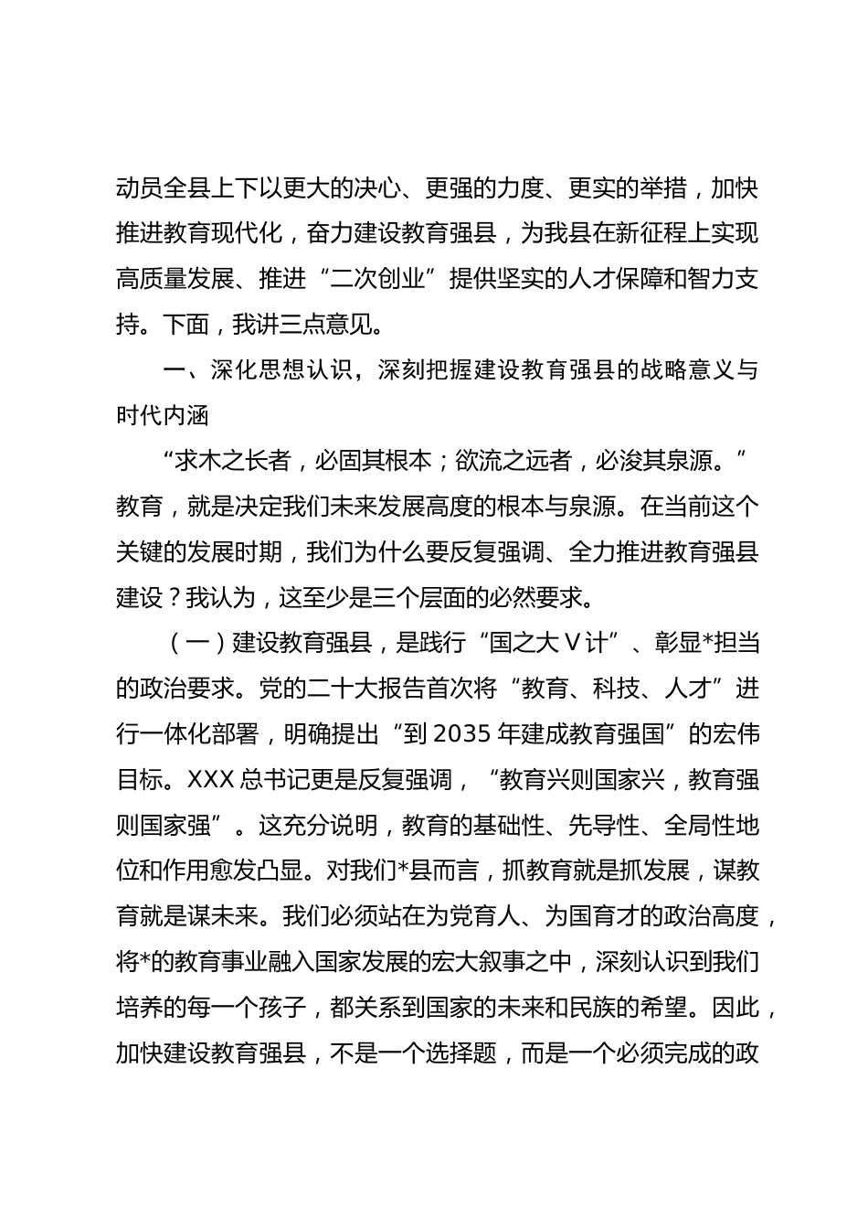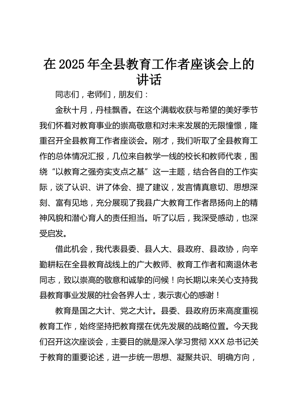 在2025年全縣教育工作者座談會上的講話同志們,老師們,朋友們:金秋十月,丹桂飄香。在這個滿載收獲與希望的美好季節(jié)我們懷著對教育事業(yè)的崇高敬意和對未來發(fā)展的無限憧憬,隆重召開全縣教育工作者座談會。剛才,我們聽取了全縣教育工作的總體情況匯報,幾位來自教學一線的校長和教師代表,圍繞“以教育之強夯實支點之基”這一主題,結(jié)合各自的工作實際,談了認識、講了體會、提了建議,發(fā)言情真意切、思想深刻、富有見地,充分展現(xiàn)了我縣廣大教育工作者昂揚向上的精神風貌和潛心育人的責任擔當。聽了以后,我深受感動,也深受啟發(fā)。借此機會,我代表縣委、縣人大、縣政...