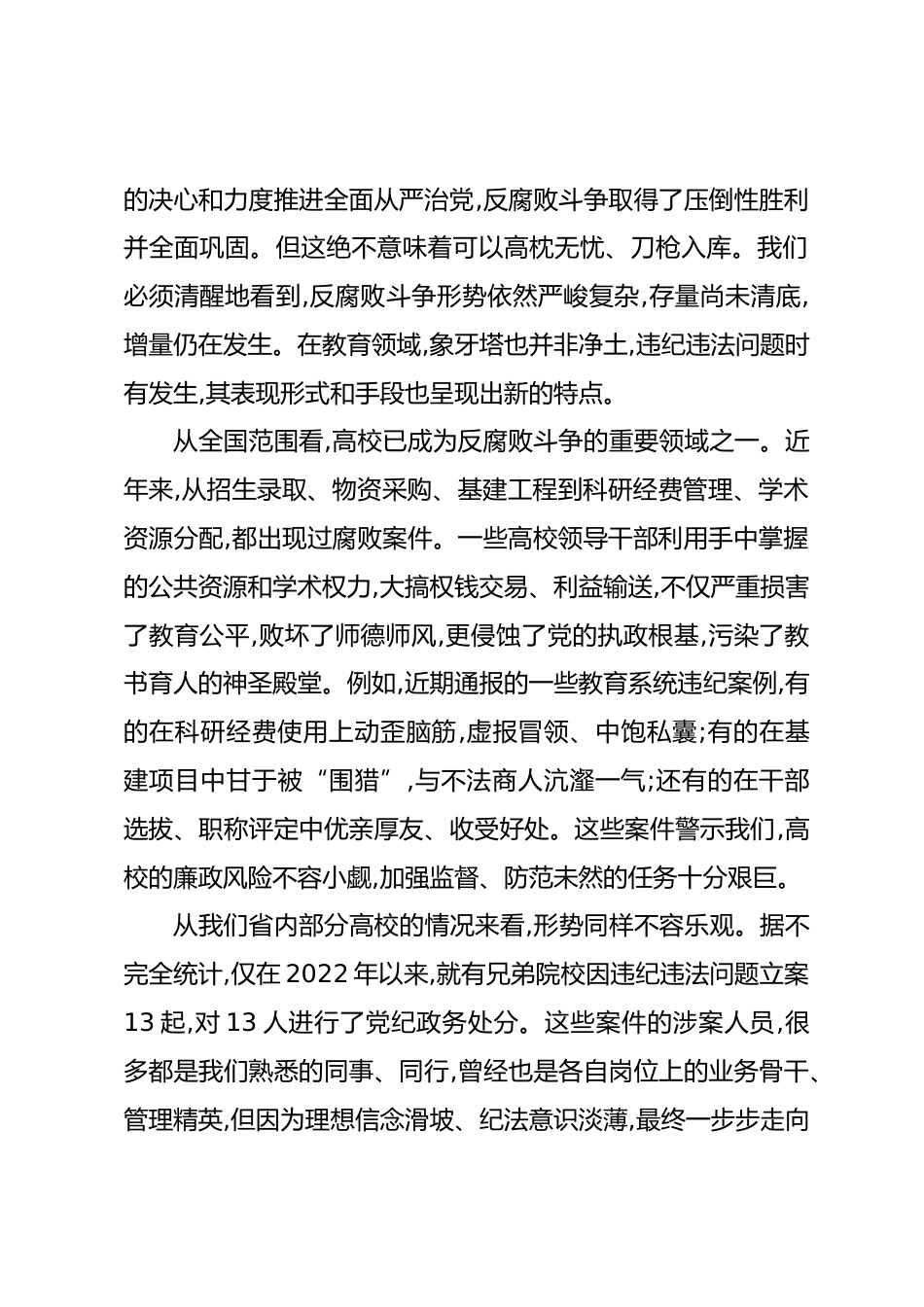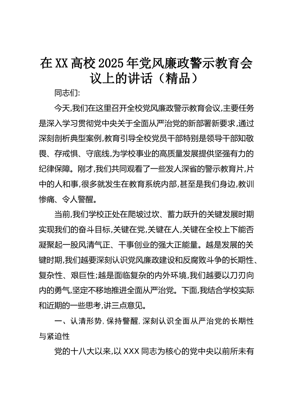 在XX高校2025年黨風(fēng)廉政警示教育會(huì)議上的講話(精品)同志們:今天,我們?cè)谶@里召開全校黨風(fēng)廉政警示教育會(huì)議,主要任務(wù)是深入學(xué)習(xí)貫徹黨中央關(guān)于全面從嚴(yán)治黨的新部署新要求,通過深刻剖析典型案例,教育引導(dǎo)全校黨員干部特別是領(lǐng)導(dǎo)干部知敬畏、存戒懼、守底線,為學(xué)校事業(yè)的高質(zhì)量發(fā)展提供堅(jiān)強(qiáng)有力的紀(jì)律保障。剛才,我們共同觀看了一些發(fā)人深省的警示教育片,片中的人和事,很多就發(fā)生在教育系統(tǒng)內(nèi)部,甚至是我們身邊,教訓(xùn)慘痛、令人警醒。當(dāng)前,我們學(xué)校正處在爬坡過坎、蓄力躍升的關(guān)鍵發(fā)展時(shí)期實(shí)現(xiàn)我們的奮斗目標(biāo),關(guān)鍵在黨,關(guān)鍵在人,關(guān)鍵在全校上下能否凝聚起一股風(fēng)清氣正、干...