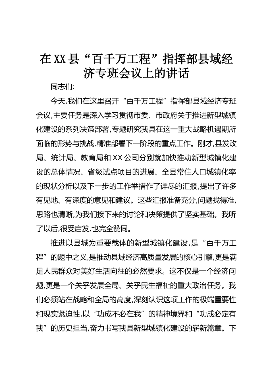 在XX縣“百千萬(wàn)工程”指揮部縣域經(jīng)濟(jì)專班會(huì)議上的講話