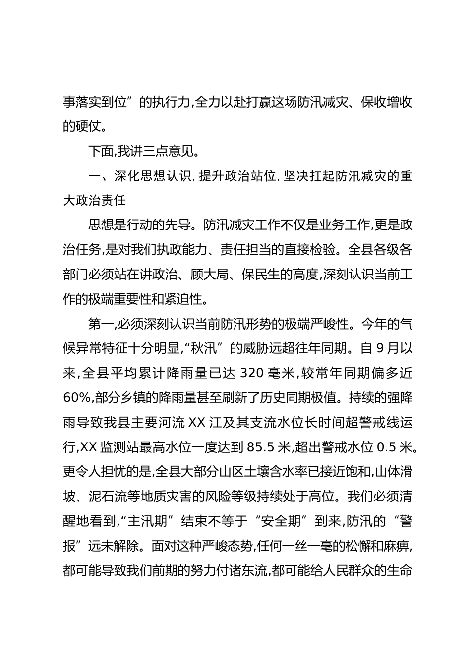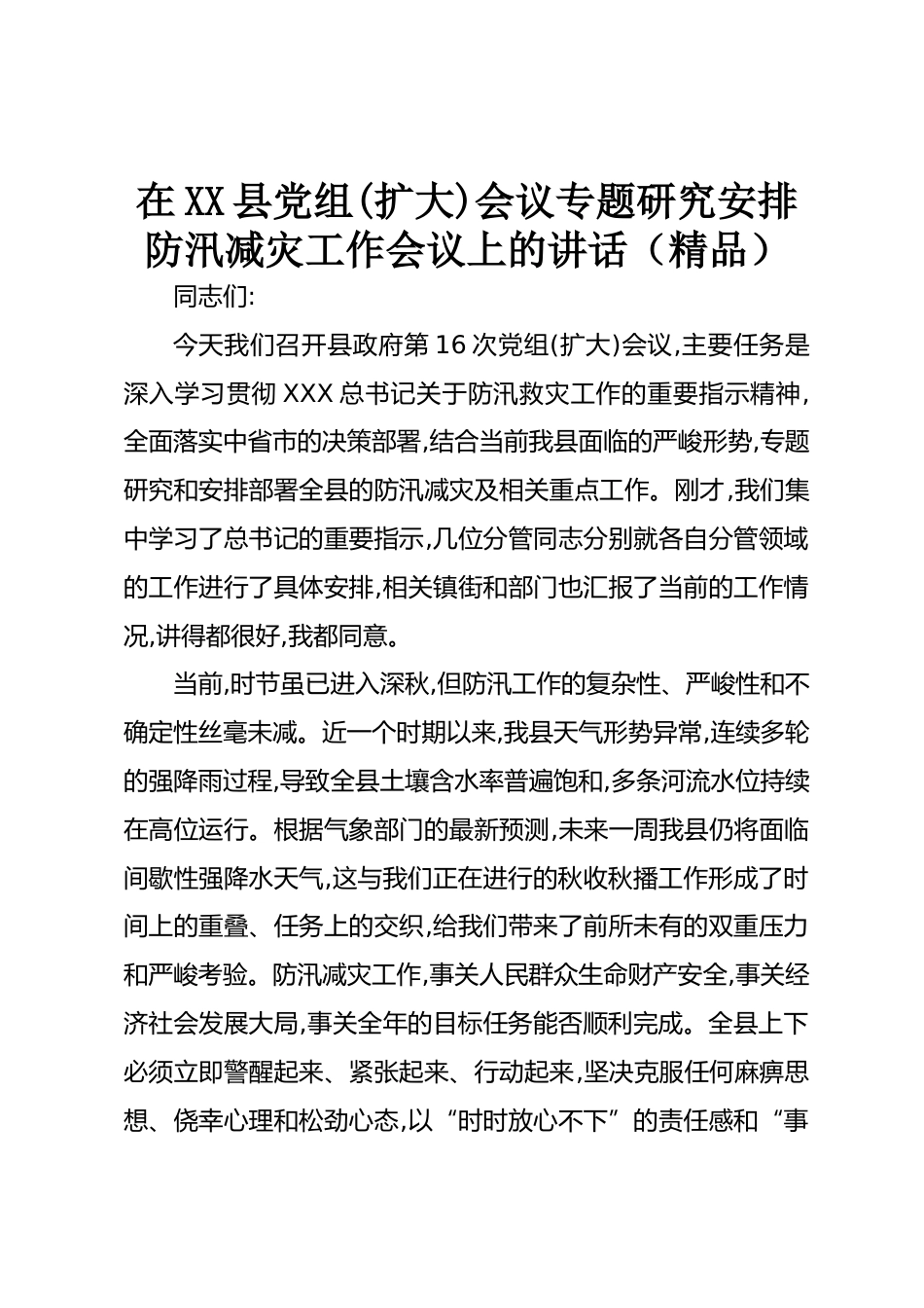 在XX縣黨組(擴(kuò)大)會議專題研究安排防汛減災(zāi)工作會議上的講話(精品)同志們:今天我們召開縣政府第16次黨組(擴(kuò)大)會議,主要任務(wù)是深入學(xué)習(xí)貫徹XXX總書記關(guān)于防汛救災(zāi)工作的重要指示精神,全面落實中省市的決策部署,結(jié)合當(dāng)前我縣面臨的嚴(yán)峻形勢,專題研究和安排部署全縣的防汛減災(zāi)及相關(guān)重點工作。剛才,我們集中學(xué)習(xí)了總書記的重要指示,幾位分管同志分別就各自分管領(lǐng)域的工作進(jìn)行了具體安排,相關(guān)鎮(zhèn)街和部門也匯報了當(dāng)前的工作情況,講得都很好,我都同意。當(dāng)前,時節(jié)雖已進(jìn)入深秋,但防汛工作的復(fù)雜性、嚴(yán)峻性和不確定性絲毫未減。近一個時期以來,我縣天氣形勢異常,連續(xù)多輪的強(qiáng)...