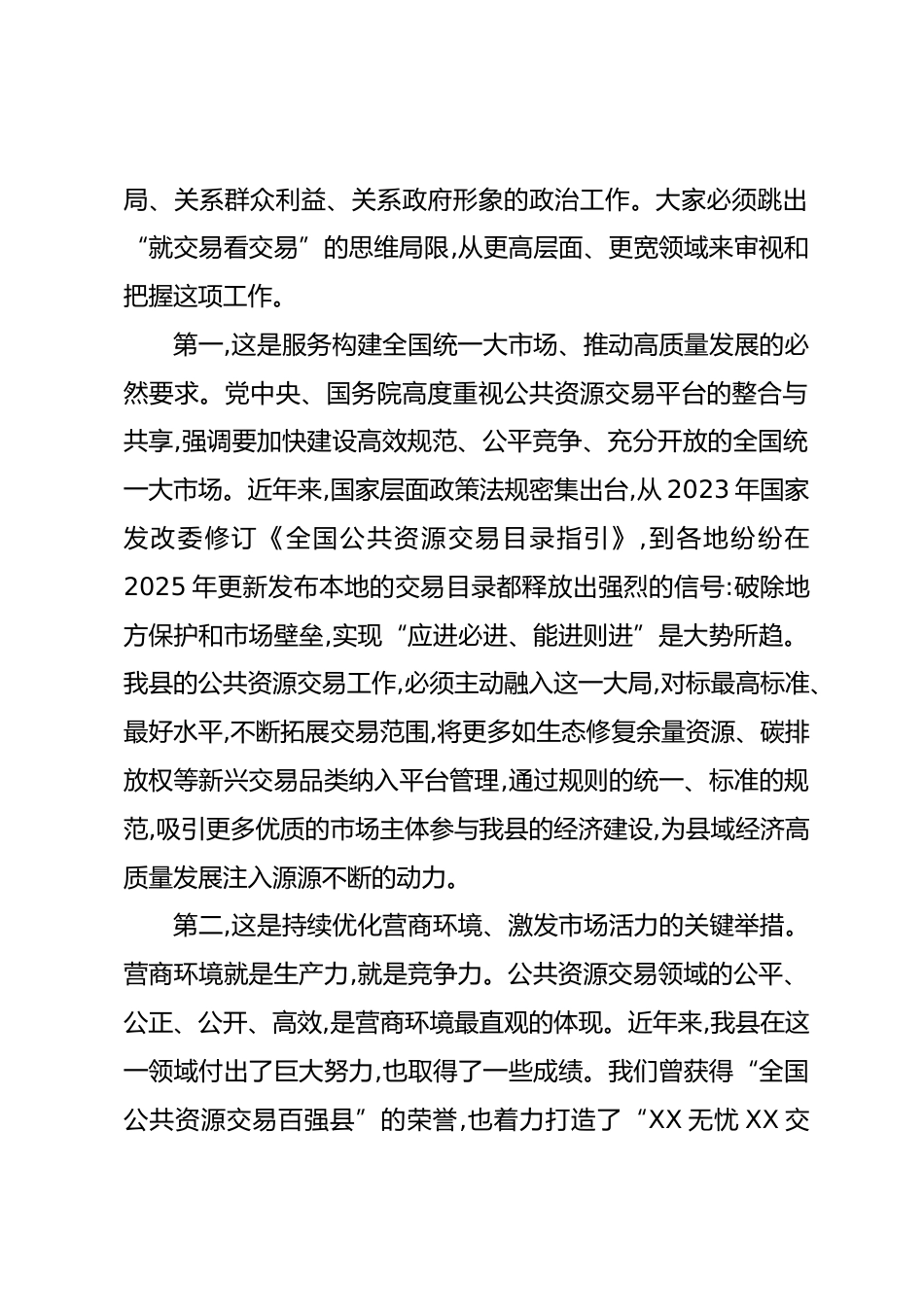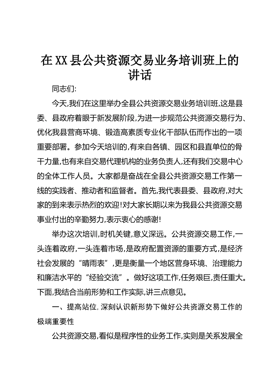 在XX縣公共資源交易業(yè)務(wù)培訓(xùn)班上的講話同志們:今天,我們在這里舉辦全縣公共資源交易業(yè)務(wù)培訓(xùn)班,這是縣委、縣政府著眼于新發(fā)展階段,為進(jìn)一步規(guī)范公共資源交易行為、優(yōu)化我縣營商環(huán)境、鍛造高素質(zhì)專業(yè)化干部隊(duì)伍而作出的一項(xiàng)重要部署。參加今天培訓(xùn)的,有來自各鎮(zhèn)、園區(qū)和縣直單位的骨干力量,也有來自交易代理機(jī)構(gòu)的業(yè)務(wù)負(fù)責(zé)人,還有我們交易中心的全體工作人員。大家都是奮戰(zhàn)在全縣公共資源交易工作第一線的實(shí)踐者、推動(dòng)者和監(jiān)督者。首先,我代表縣委、縣政府,對大家的到來表示熱烈的歡迎!對大家長期以來為我縣公共資源交易事業(yè)付出的辛勤努力,表示衷心的感謝!舉辦這次培訓(xùn),...