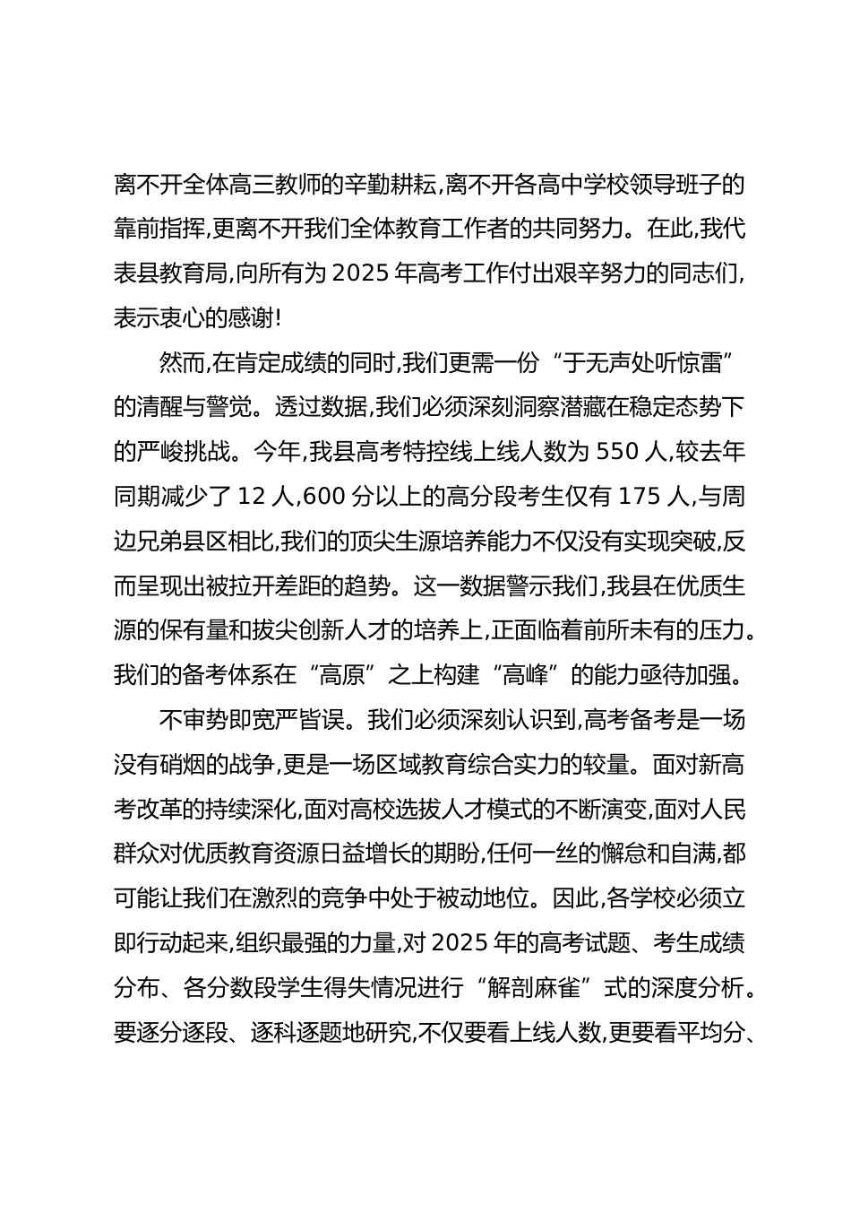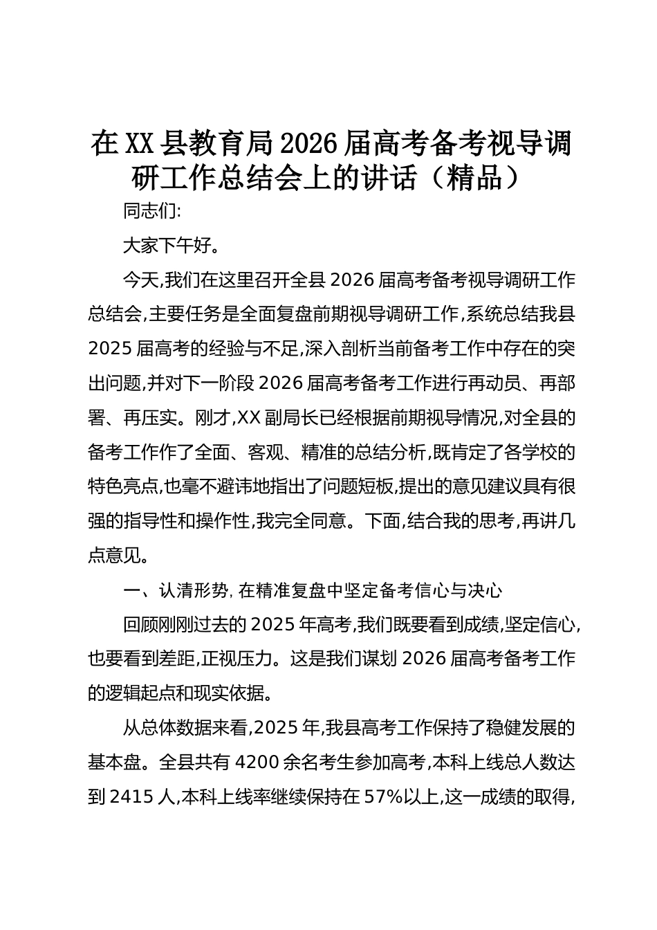 在XX縣教育局2026屆高考備考視導調(diào)研工作總結(jié)會上的講話(精品)同志們:大家下午好。今天,我們在這里召開全縣2026屆高考備考視導調(diào)研工作總結(jié)會,主要任務是全面復盤前期視導調(diào)研工作,系統(tǒng)總結(jié)我縣2025屆高考的經(jīng)驗與不足,深入剖析當前備考工作中存在的突出問題,并對下一階段2026屆高考備考工作進行再動員、再部署、再壓實。剛才,XX副局長已經(jīng)根據(jù)前期視導情況,對全縣的備考工作作了全面、客觀、精準的總結(jié)分析,既肯定了各學校的特色亮點,也毫不避諱地指出了問題短板,提出的意見建議具有很強的指導性和操作性,我完全同意。下面,結(jié)合我的思考,再講幾點意見。一、認清形勢,...