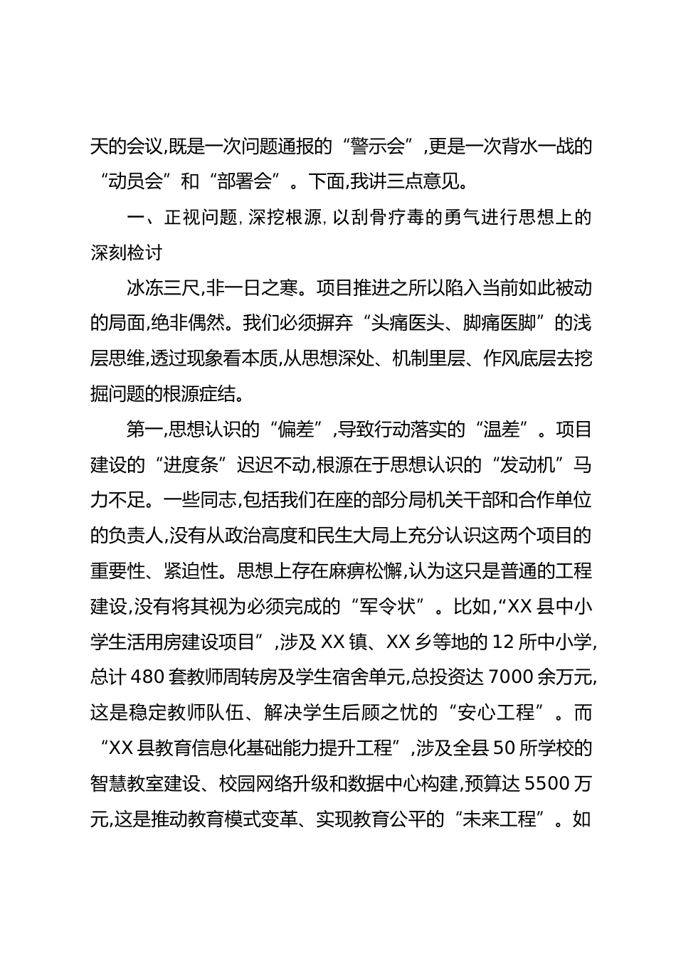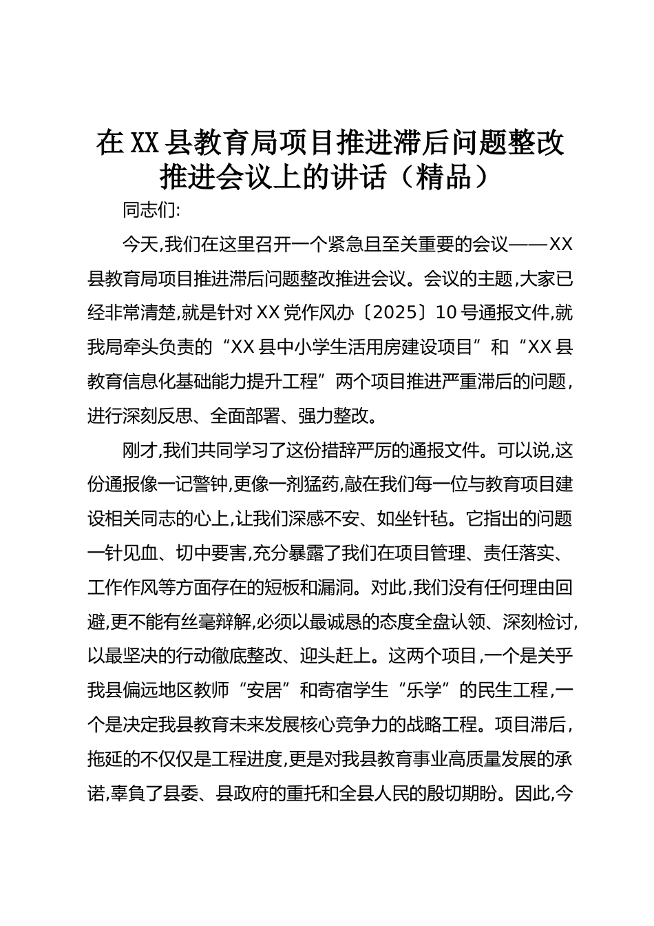 在XX縣教育局項目推進滯后問題整改推進會議上的講話(精品)同志們:今天,我們在這里召開一個緊急且至關重要的會議——XX縣教育局項目推進滯后問題整改推進會議。會議的主題,大家已經(jīng)非常清楚,就是針對XX黨作風辦〔2025〕10號通報文件,就我局牽頭負責的“XX縣中小學生活用房建設項目”和“XX縣教育信息化基礎能力提升工程”兩個項目推進嚴重滯后的問題,進行深刻反思、全面部署、強力整改。剛才,我們共同學習了這份措辭嚴厲的通報文件??梢哉f,這份通報像一記警鐘,更像一劑猛藥,敲在我們每一位與教育項目建設相關同志的心上,讓我們深感不安、如坐針氈。它指出的問題一針見...