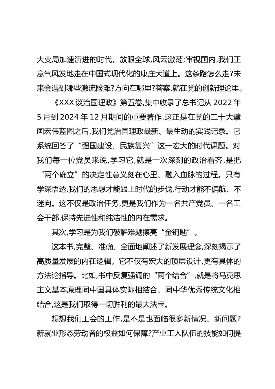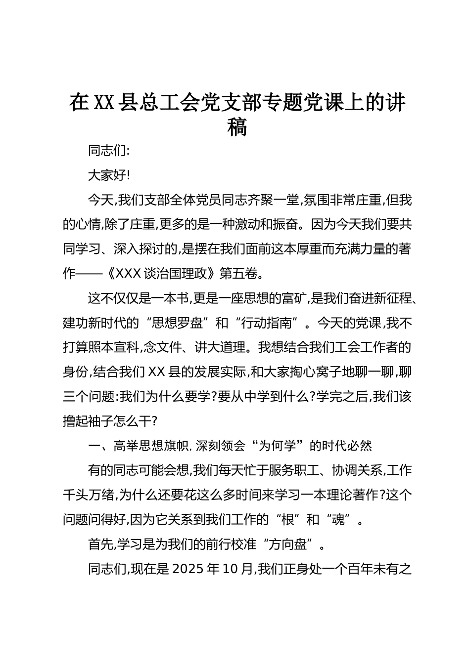在XX縣總工會(huì)黨支部專題黨課上的講稿同志們:大家好!今天,我們支部全體黨員同志齊聚一堂,氛圍非常莊重,但我的心情,除了莊重,更多的是一種激動(dòng)和振奮。因?yàn)榻裉煳覀円餐瑢W(xué)習(xí)、深入探討的,是擺在我們面前這本厚重而充滿力量的著作——《XXX談治國理政》第五卷。這不僅僅是一本書,更是一座思想的富礦,是我們奮進(jìn)新征程、建功新時(shí)代的“思想羅盤”和“行動(dòng)指南”。今天的黨課,我不打算照本宣科,念文件、講大道理。我想結(jié)合我們工會(huì)工作者的身份,結(jié)合我們XX縣的發(fā)展實(shí)際,和大家掏心窩子地聊一聊,聊三個(gè)問題:我們?yōu)槭裁匆獙W(xué)?要從中學(xué)到什么?學(xué)完之后,我們?cè)摂]起袖子怎么干?一...