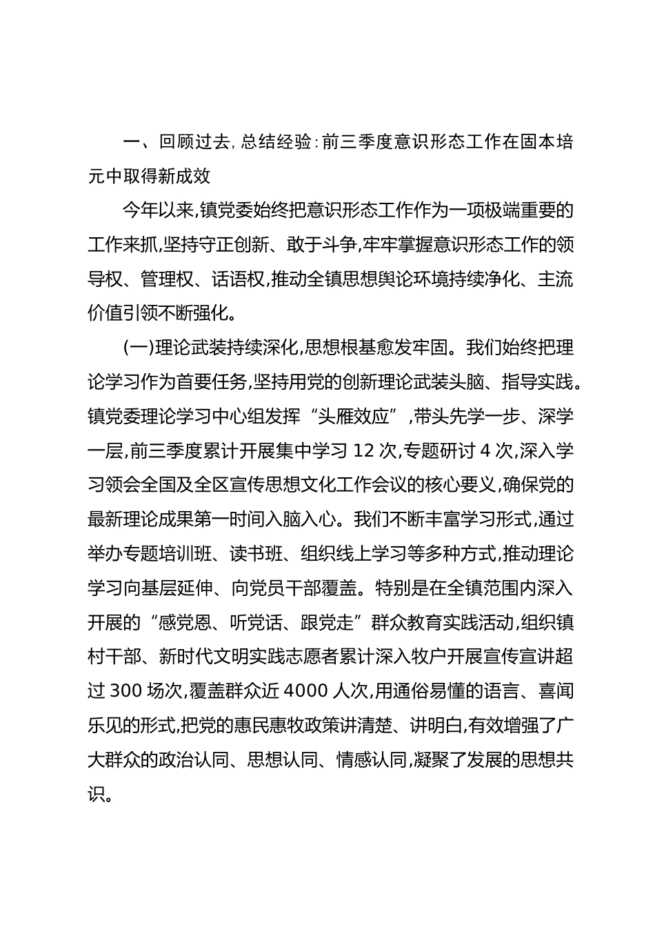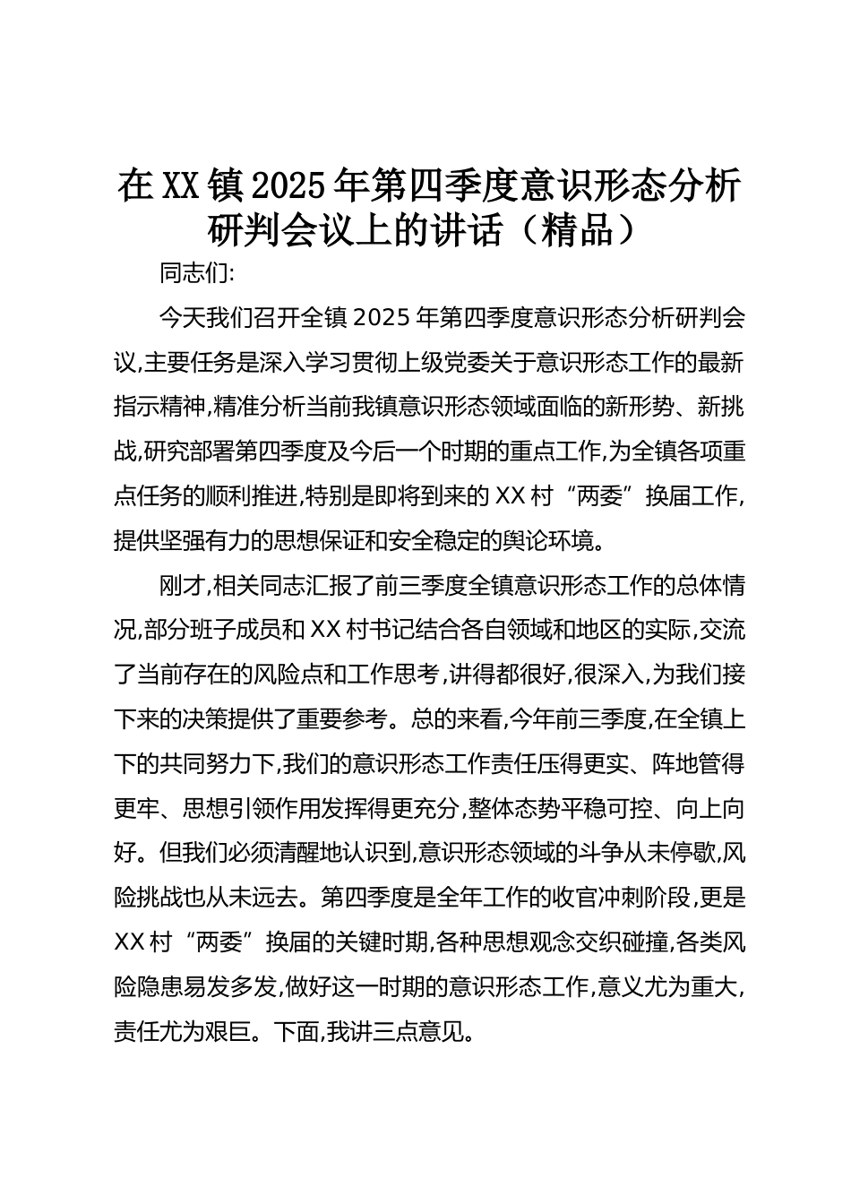 在XX鎮(zhèn)2025年第四季度意識(shí)形態(tài)分析研判會(huì)議上的講話(精品)同志們:今天我們召開全鎮(zhèn)2025年第四季度意識(shí)形態(tài)分析研判會(huì)議,主要任務(wù)是深入學(xué)習(xí)貫徹上級(jí)黨委關(guān)于意識(shí)形態(tài)工作的最新指示精神,精準(zhǔn)分析當(dāng)前我鎮(zhèn)意識(shí)形態(tài)領(lǐng)域面臨的新形勢(shì)、新挑戰(zhàn),研究部署第四季度及今后一個(gè)時(shí)期的重點(diǎn)工作,為全鎮(zhèn)各項(xiàng)重點(diǎn)任務(wù)的順利推進(jìn),特別是即將到來的XX村“兩委”換屆工作,提供堅(jiān)強(qiáng)有力的思想保證和安全穩(wěn)定的輿論環(huán)境。剛才,相關(guān)同志匯報(bào)了前三季度全鎮(zhèn)意識(shí)形態(tài)工作的總體情況,部分班子成員和XX村書記結(jié)合各自領(lǐng)域和地區(qū)的實(shí)際,交流了當(dāng)前存在的風(fēng)險(xiǎn)點(diǎn)和工作思考,講得都很好,很深入,為...