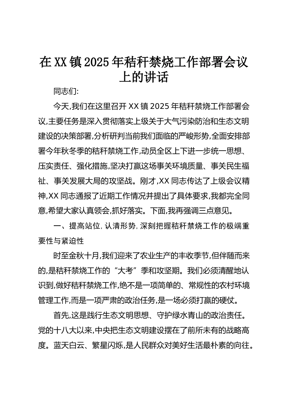 在XX鎮(zhèn)2025年秸稈禁燒工作部署會(huì)議上的講話同志們:今天,我們在這里召開XX鎮(zhèn)2025年秸稈禁燒工作部署會(huì)議,主要任務(wù)是深入貫徹落實(shí)上級(jí)關(guān)于大氣污染防治和生態(tài)文明建設(shè)的決策部署,分析研判當(dāng)前我們面臨的嚴(yán)峻形勢,全面安排部署今年秋冬季的秸稈禁燒工作,動(dòng)員全區(qū)上下進(jìn)一步統(tǒng)一思想、壓實(shí)責(zé)任、強(qiáng)化措施,堅(jiān)決打贏這場事關(guān)環(huán)境質(zhì)量、事關(guān)民生福祉、事關(guān)發(fā)展大局的攻堅(jiān)戰(zhàn)。剛才,XX同志傳達(dá)了上級(jí)會(huì)議精神,XX同志通報(bào)了近期工作情況并提出了具體要求,我都完全同意,希望大家認(rèn)真領(lǐng)會(huì),抓好落實(shí)。下面,我再強(qiáng)調(diào)三點(diǎn)意見。一、提高站位,認(rèn)清形勢,深刻把握秸稈禁燒工作的極端重要性...
