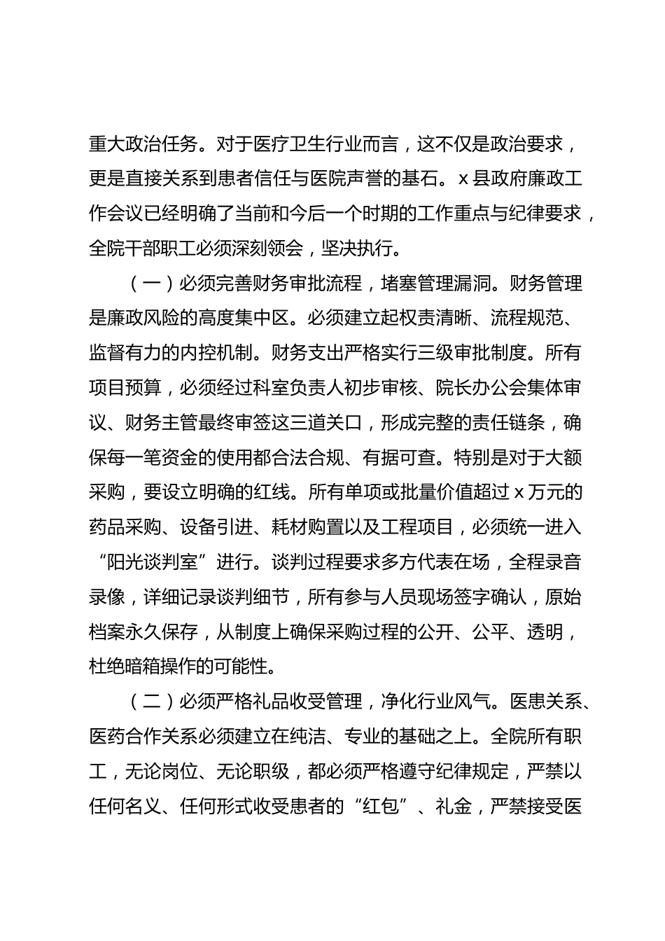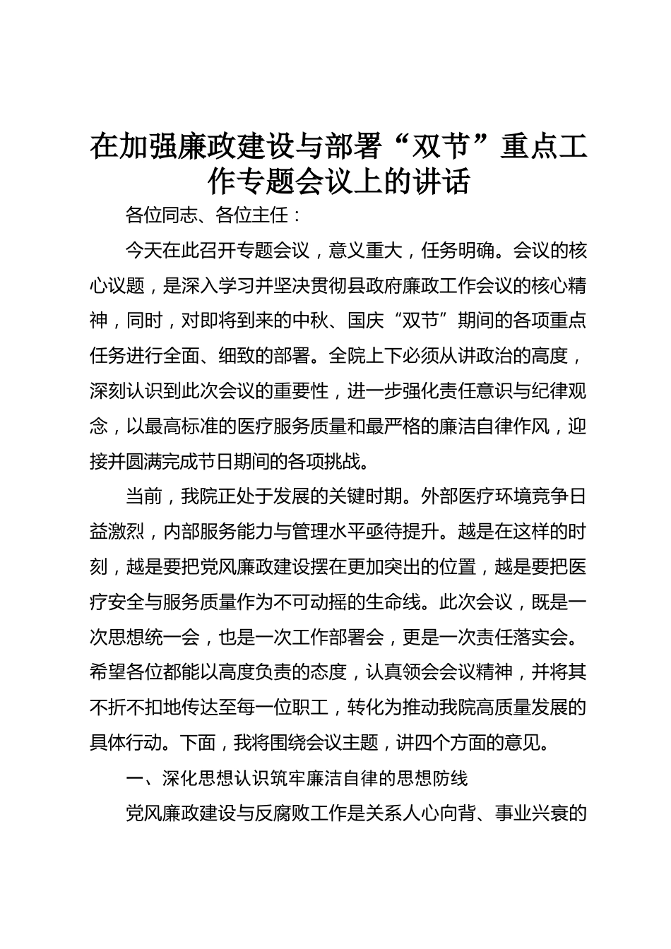 在加強(qiáng)廉政建設(shè)與部署“雙節(jié)”重點(diǎn)工作專題會(huì)議上的講話各位同志、各位主任:今天在此召開專題會(huì)議,意義重大,任務(wù)明確。會(huì)議的核心議題,是深入學(xué)習(xí)并堅(jiān)決貫徹縣政府廉政工作會(huì)議的核心精神,同時(shí),對(duì)即將到來的中秋、國慶“雙節(jié)”期間的各項(xiàng)重點(diǎn)任務(wù)進(jìn)行全面、細(xì)致的部署。全院上下必須從講政治的高度,深刻認(rèn)識(shí)到此次會(huì)議的重要性,進(jìn)一步強(qiáng)化責(zé)任意識(shí)與紀(jì)律觀念,以最高標(biāo)準(zhǔn)的醫(yī)療服務(wù)質(zhì)量和最嚴(yán)格的廉潔自律作風(fēng),迎接并圓滿完成節(jié)日期間的各項(xiàng)挑戰(zhàn)。當(dāng)前,我院正處于發(fā)展的關(guān)鍵時(shí)期。外部醫(yī)療環(huán)境競(jìng)爭(zhēng)日益激烈,內(nèi)部服務(wù)能力與管理水平亟待提升。越是在這樣的時(shí)刻...