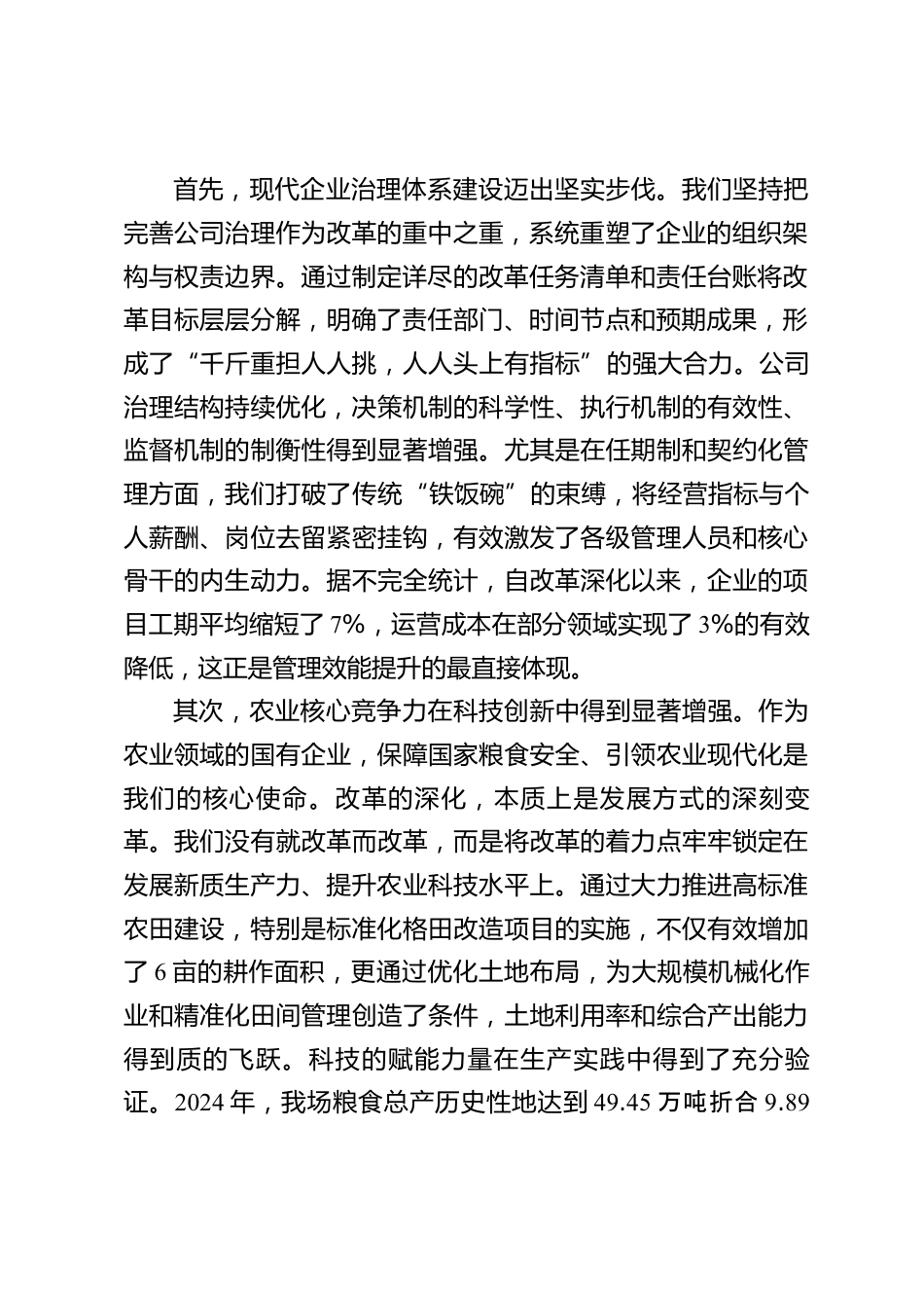 在某某農(nóng)場國企改革深化提升行動高質(zhì)量收官工作推進會議上的講話同志們:今天,我們召開這次專題會議,主要任務(wù)是深入貫徹落實某某集團關(guān)于國企改革深化提升行動的最新部署要求,全面盤點當前進展,精準研判形勢任務(wù),動員全場上下進一步統(tǒng)一思想、凝聚共識、壓實責(zé)任,以決戰(zhàn)決勝的姿態(tài),全力沖刺第四季度,確保我場國企改革深化提升行動取得圓滿成功和實質(zhì)性成效。2025年是國企改革深化提升行動的收官之年,現(xiàn)在距離年底僅剩不到四個月的時間,已經(jīng)到了發(fā)起總攻、奪取全勝的關(guān)鍵時刻。剛才,相關(guān)部室負責(zé)同志匯報了各自領(lǐng)域的改革進展情況,總體來看,成效是顯著的,但...