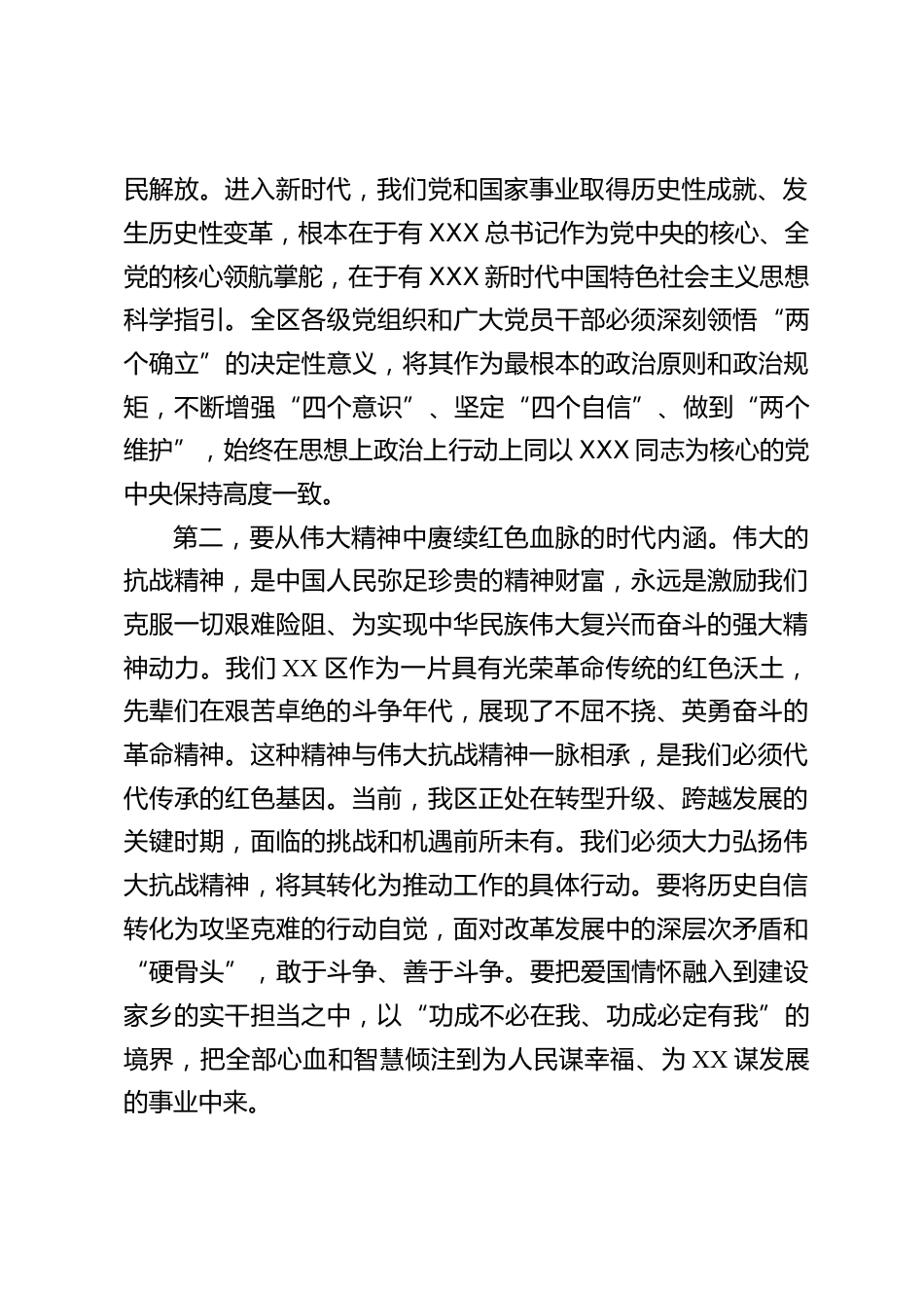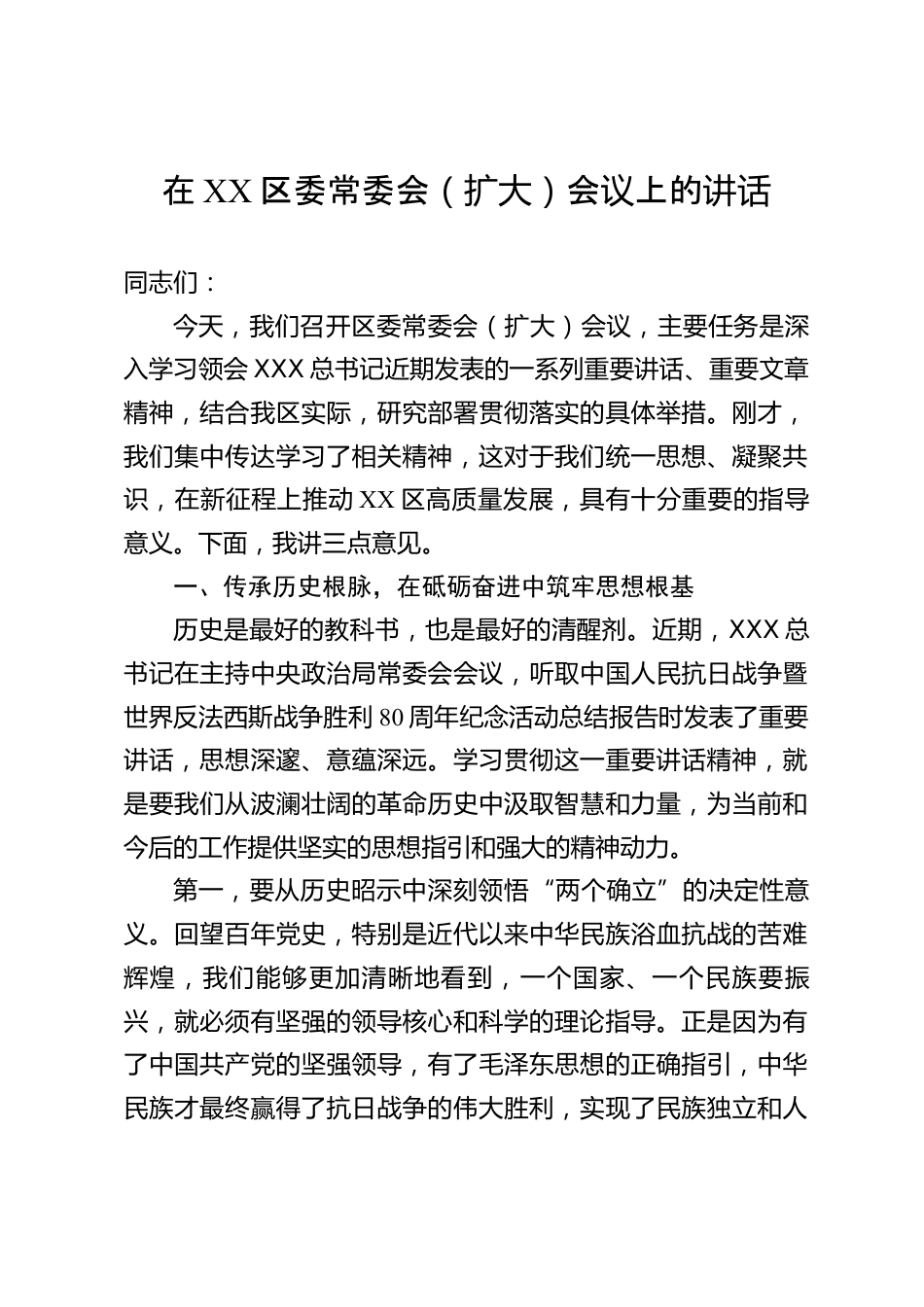 在XX區(qū)委常委會(huì)(擴(kuò)大)會(huì)議上的講話同志們:今天,我們召開區(qū)委常委會(huì)(擴(kuò)大)會(huì)議,主要任務(wù)是深入學(xué)習(xí)領(lǐng)會(huì)XXX總書記近期發(fā)表的一系列重要講話、重要文章精神,結(jié)合我區(qū)實(shí)際,研究部署貫徹落實(shí)的具體舉措。剛才,我們集中傳達(dá)學(xué)習(xí)了相關(guān)精神,這對(duì)于我們統(tǒng)一思想、凝聚共識(shí),在新征程上推動(dòng)XX區(qū)高質(zhì)量發(fā)展,具有十分重要的指導(dǎo)意義。下面,我講三點(diǎn)意見。一、傳承歷史根脈,在砥礪奮進(jìn)中筑牢思想根基歷史是最好的教科書,也是最好的清醒劑。近期,XXX總書記在主持中央政治局常委會(huì)會(huì)議,聽取中國人民抗日戰(zhàn)爭暨世界反法西斯戰(zhàn)爭勝利80周年紀(jì)念活動(dòng)總結(jié)報(bào)告時(shí)發(fā)表了重要...