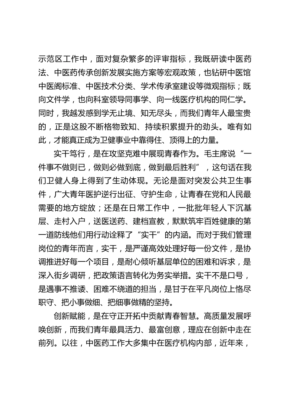 在全區(qū)衛(wèi)健委青年座談會發(fā)言材料匯編(5篇)目錄1.以青春之我,奉獻杏林春暖新時代12.淬煉青春本色書寫疾控監(jiān)督擔(dān)當(dāng)43.以“匠心”提升綜合素養(yǎng)44.創(chuàng)新破題護泌尿,奉獻擔(dān)當(dāng)顯初心65.筑牢“隱形防線”彰顯青春擔(dān)當(dāng)8以青春之我,奉獻杏林春暖新時代作為衛(wèi)生健康戰(zhàn)線上的年輕工作者,我們既是事業(yè)發(fā)展的生力軍,也是改革創(chuàng)新的先鋒隊,我想結(jié)合自己實際工作中的實踐與感悟,從“以學(xué)筑基、以干踐行、以新賦能”三個方面,和大家分享我對青春奉獻與事業(yè)擔(dān)當(dāng)?shù)睦斫?。以學(xué)為先,是在傳承與積累中筑牢擔(dān)當(dāng)根基。XXX總書記曾引用“學(xué)如弓弩,才如箭鏃”來勉勵青年勤學(xué)不輟。我深...