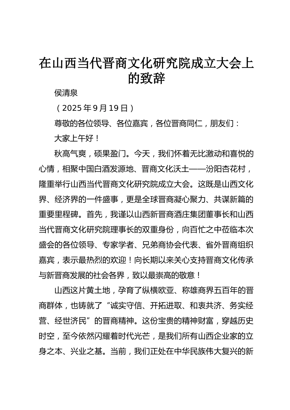 在山西當(dāng)代晉商文化研究院成立大會上的致辭侯清泉(2025年9月19日)尊敬的各位領(lǐng)導(dǎo)、各位嘉賓,各位晉商同仁,朋友們:大家上午好!秋高氣爽,碩果盈門。今天,我們懷著無比激動和喜悅的心情,相聚中國白酒發(fā)源地、晉商文化沃土——汾陽杏花村,隆重舉行山西當(dāng)代晉商文化研究院成立大會。這既是山西文化界、經(jīng)濟界的一件盛事,更是全球晉商凝心聚力、共謀新篇的重要里程碑。首先,我謹(jǐn)以山西新晉商酒莊集團董事長和山西當(dāng)代晉商文化研究院理事長的雙重身份,向百忙之中蒞臨本次盛會的各位領(lǐng)導(dǎo)、專家學(xué)者、兄弟商協(xié)會代表、省外晉商組織嘉賓,表示最熱烈的歡迎!向長期以...