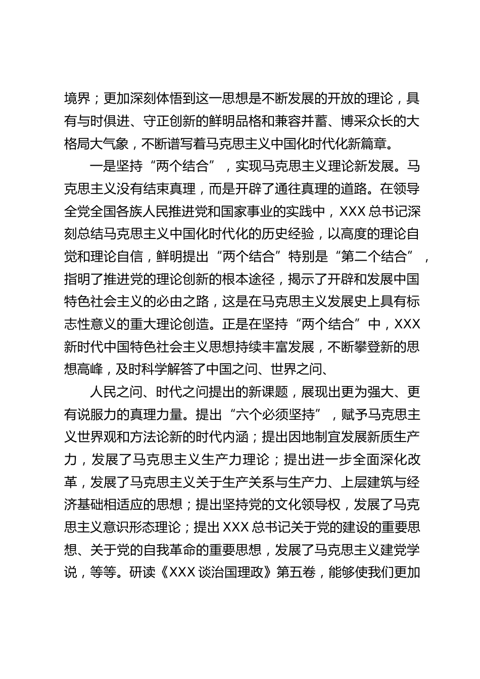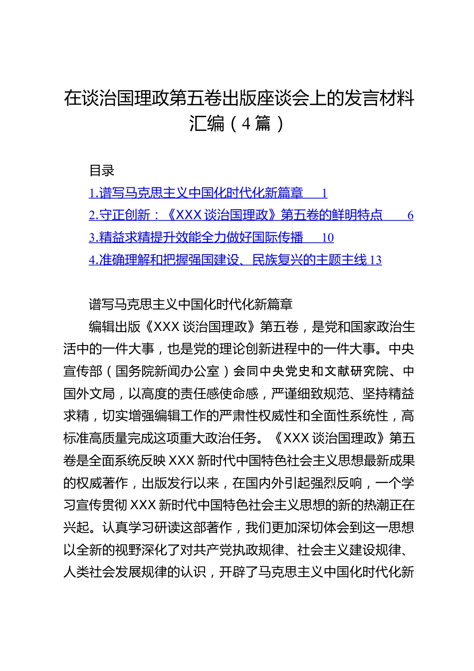 在談治國(guó)理政第五卷出版座談會(huì)上的發(fā)言材料匯編(4篇)目錄1.譜寫馬克思主義中國(guó)化時(shí)代化新篇章12.守正創(chuàng)新:《XXX談治國(guó)理政》第五卷的鮮明特點(diǎn)63.精益求精提升效能全力做好國(guó)際傳播104.準(zhǔn)確理解和把握強(qiáng)國(guó)建設(shè)、民族復(fù)興的主題主線13譜寫馬克思主義中國(guó)化時(shí)代化新篇章編輯出版《XXX談治國(guó)理政》第五卷,是黨和國(guó)家政治生活中的一件大事,也是黨的理論創(chuàng)新進(jìn)程中的一件大事。中央宣傳部(國(guó)務(wù)院新聞辦公室)會(huì)同中央黨史和文獻(xiàn)研究院、中國(guó)外文局,以高度的責(zé)任感使命感,嚴(yán)謹(jǐn)細(xì)致規(guī)范、堅(jiān)持精益求精,切實(shí)增強(qiáng)編輯工作的嚴(yán)肅性權(quán)威性和全面性系統(tǒng)性,高標(biāo)準(zhǔn)高質(zhì)量完成...