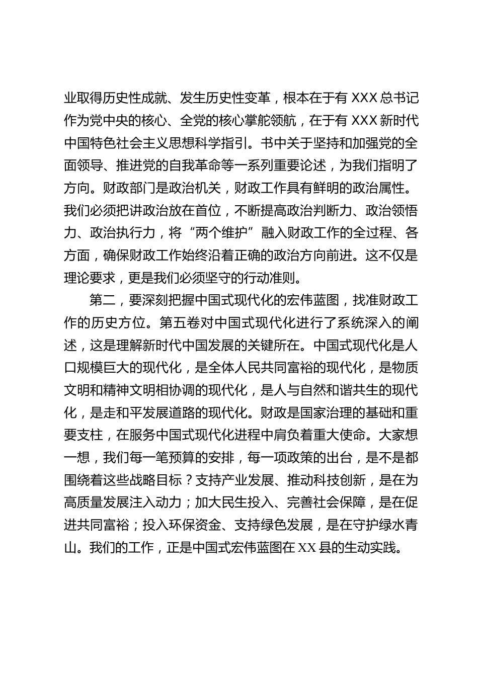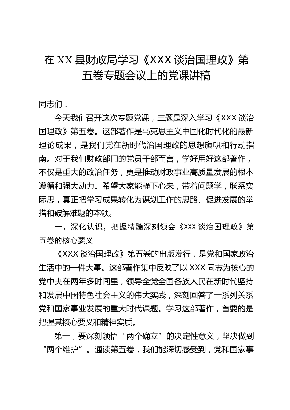在XX縣財政局學(xué)習(xí)《XXX談治國理政》第五卷專題會議上的黨課講稿同志們:今天我們召開這次專題黨課,主題是深入學(xué)習(xí)《XXX談治國理政》第五卷。這部著作是馬克思主義中國化時代化的最新理論成果,是我們黨在新時代治國理政的思想旗幟和行動指南。對于我們財政部門的黨員干部而言,學(xué)好用好這部著作,不僅是重大的政治任務(wù),更是推動財政事業(yè)高質(zhì)量發(fā)展的根本遵循和強大動力。希望大家能靜下心來,帶著問題學(xué),聯(lián)系實際思,真正把學(xué)習(xí)成果轉(zhuǎn)化為謀劃工作的思路、促進發(fā)展的舉措和破解難題的本領(lǐng)。一、深化認識,把握精髓深刻領(lǐng)會《XXX談治國理政》第五卷的核心要義《XXX談治...