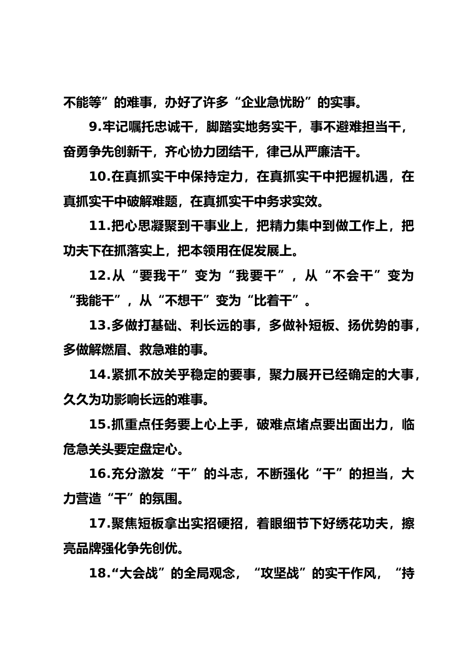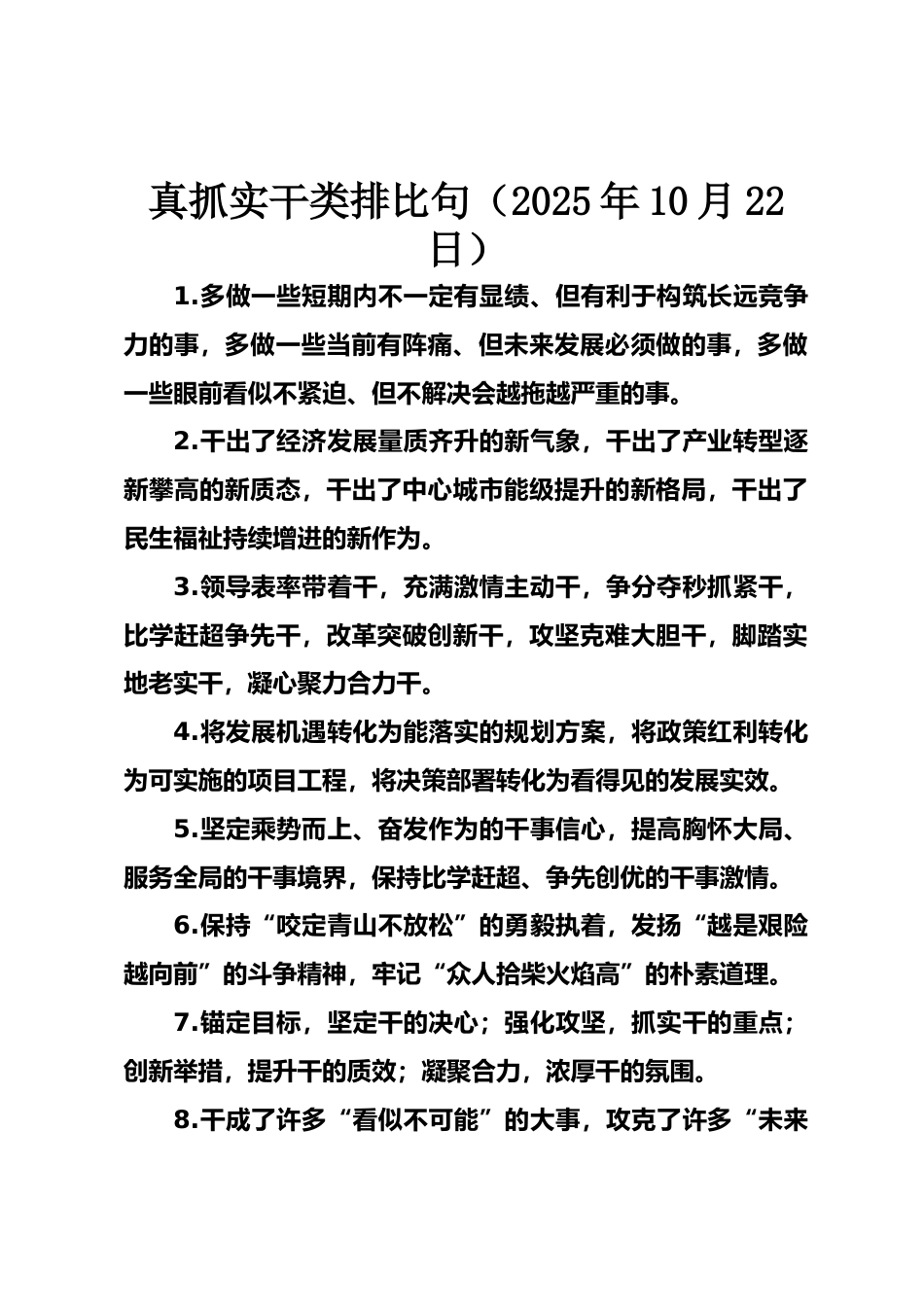 真抓實干類排比句(2025年10月22日)1.多做一些短期內(nèi)不一定有顯績、但有利于構(gòu)筑長遠競爭力的事,多做一些當前有陣痛、但未來發(fā)展必須做的事,多做一些眼前看似不緊迫、但不解決會越拖越嚴重的事。2.干出了經(jīng)濟發(fā)展量質(zhì)齊升的新氣象,干出了產(chǎn)業(yè)轉(zhuǎn)型逐新攀高的新質(zhì)態(tài),干出了中心城市能級提升的新格局,干出了民生福祉持續(xù)增進的新作為。3.領(lǐng)導(dǎo)表率帶著干,充滿激情主動干,爭分奪秒抓緊干,比學(xué)趕超爭先干,改革突破創(chuàng)新干,攻堅克難大膽干,腳踏實地老實干,凝心聚力合力干。4.將發(fā)展機遇轉(zhuǎn)化為能落實的規(guī)劃方案,將政策紅利轉(zhuǎn)化為可實施的項目工程,將決策部署轉(zhuǎn)化為...