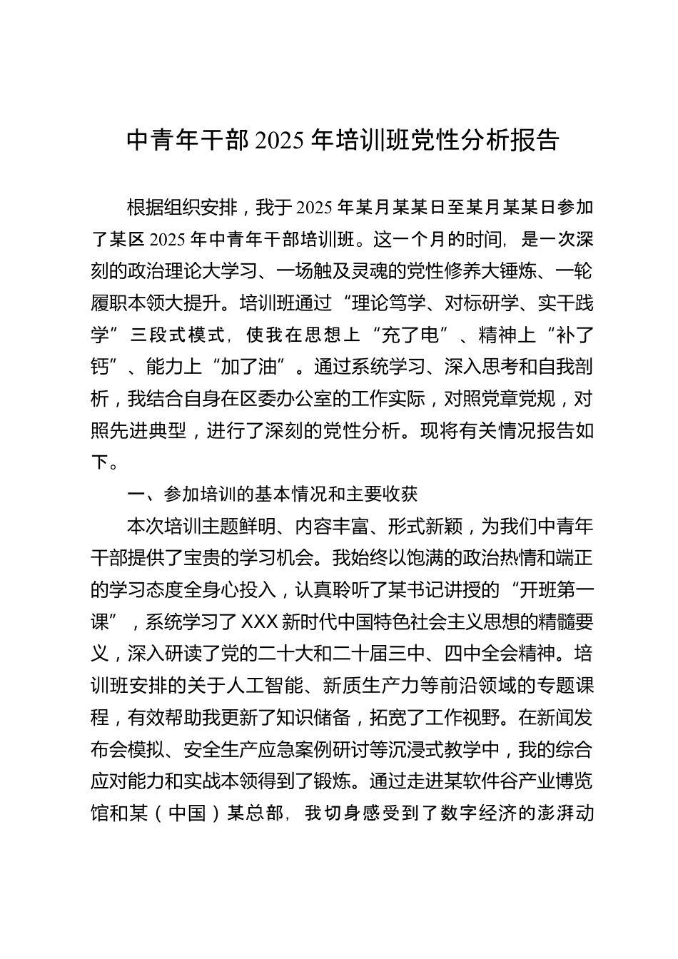 中青年干部2025年培班黨性分析告訓報根據(jù)組織安排,我于2025年某月某某日至某月某某日參加了某區(qū)2025年中青年干部培班。一個月的,是一次深訓這時間刻的政治理論大學習、一場觸及靈魂的黨性修養(yǎng)大錘煉、一輪履職本領大提升。培訓班通過“理論篤學、對標研學、實干踐學”三段式模式,使我在思想上“充了電”、精神上“補了鈣”、能力上“加了油”。通過系統(tǒng)學習、深入思考和自我剖析,我結(jié)合自身在區(qū)委辦公室的工作實際,對照黨章黨規(guī),對照先進典型,進行了深刻的黨性分析?,F(xiàn)將有關情況報告如下。一、參加培訓的基本情況和主要收獲本次培訓主題鮮明、內(nèi)容豐富、形式新穎...