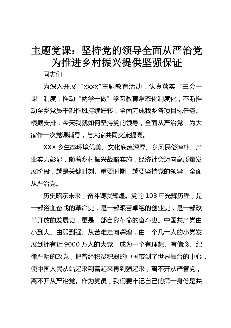 主題黨課:堅(jiān)持黨的領(lǐng)導(dǎo)全面從嚴(yán)治黨為推進(jìn)鄉(xiāng)村振興提供堅(jiān)強(qiáng)保證同志們:為深入開(kāi)展“xxxx”主題教育活動(dòng),認(rèn)真落實(shí)“三會(huì)一課”制度,推動(dòng)“兩學(xué)一做”學(xué)習(xí)教育常態(tài)化制度化,不斷推動(dòng)全鄉(xiāng)黨員干部作風(fēng)持續(xù)好轉(zhuǎn),全面完成我鄉(xiāng)各項(xiàng)目標(biāo)任務(wù)。根據(jù)安排,今天我就如何堅(jiān)持黨的領(lǐng)導(dǎo),全面從嚴(yán)治黨,為大家作一次黨課輔導(dǎo),與大家共同交流提高。XXX鄉(xiāng)生態(tài)環(huán)境優(yōu)美、文化底蘊(yùn)深厚、鄉(xiāng)風(fēng)民俗淳樸、產(chǎn)業(yè)實(shí)力彰顯,隨著鄉(xiāng)村振興戰(zhàn)略實(shí)施,經(jīng)濟(jì)社會(huì)邁向高質(zhì)量發(fā)展階段,越是關(guān)鍵時(shí)刻、重要時(shí)期,越要堅(jiān)持黨的領(lǐng)導(dǎo),全面從嚴(yán)治黨。歷史昭示未來(lái),奮斗鑄就輝煌。黨的103年光輝歷程,...