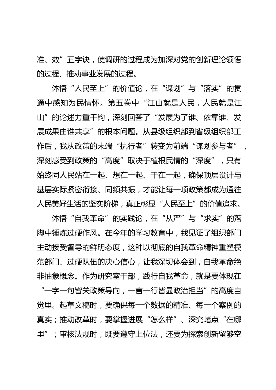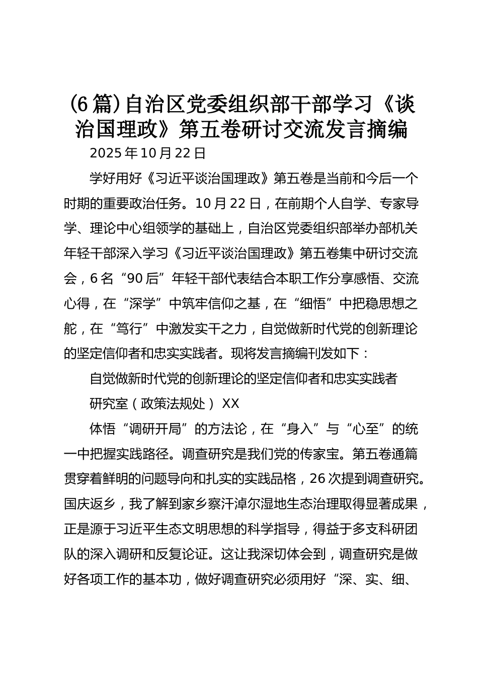 (6篇)自治區(qū)黨委組織部干部學習《談治國理政》第五卷研討交流發(fā)言摘編2025年10月22日學好用好《習近平談治國理政》第五卷是當前和今后一個時期的重要政治任務。10月22日,在前期個人自學、專家導學、理論中心組領(lǐng)學的基礎(chǔ)上,自治區(qū)黨委組織部舉辦部機關(guān)年輕干部深入學習《習近平談治國理政》第五卷集中研討交流會,6名“90后”年輕干部代表結(jié)合本職工作分享感悟、交流心得,在“深學”中筑牢信仰之基,在“細悟”中把穩(wěn)思想之舵,在“篤行”中激發(fā)實干之力,自覺做新時代黨的創(chuàng)新理論的堅定信仰者和忠實實踐者。現(xiàn)將發(fā)言摘編刊發(fā)如下:自覺做新時代黨的創(chuàng)新理論的堅定信...