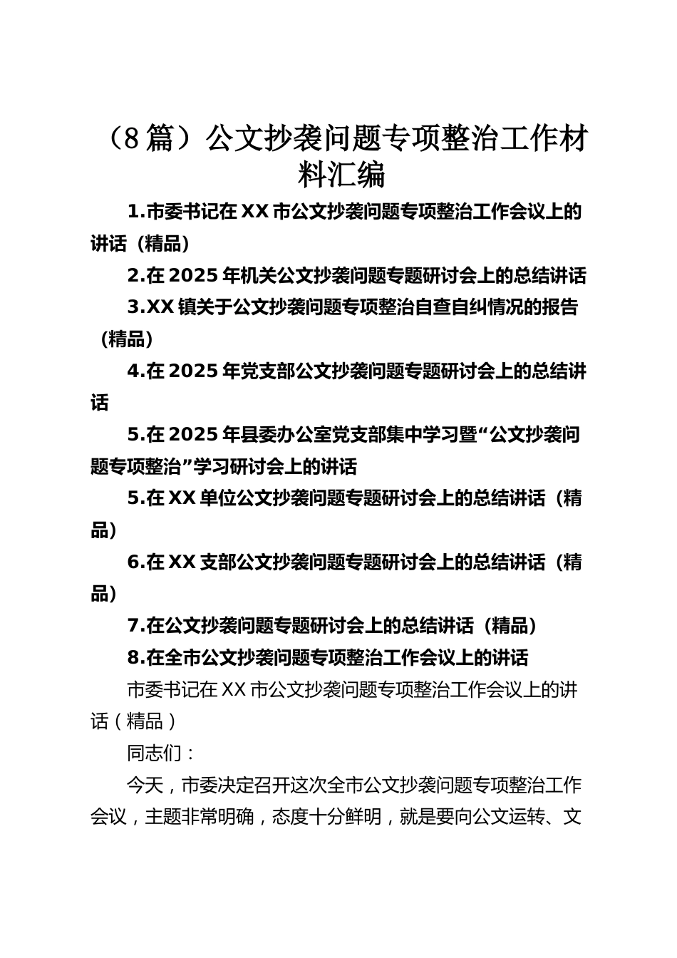 (8篇)公文抄襲問題專項整治工作材料匯編1.市委書記在XX市公文抄襲問題專項整治工作會議上的講話(精品)2.在2025年機關(guān)公文抄襲問題專題研討會上的總結(jié)講話3.XX鎮(zhèn)關(guān)于公文抄襲問題專項整治自查自糾情況的報告(精品)4.在2025年黨支部公文抄襲問題專題研討會上的總結(jié)講話5.在2025“年縣委辦公室黨支部集中學(xué)習(xí)暨公文抄襲問”題專項整治學(xué)習(xí)研討會上的講話5.在XX單位公文抄襲問題專題研討會上的總結(jié)講話(精品)6.在XX支部公文抄襲問題專題研討會上的總結(jié)講話(精品)7.在公文抄襲問題專題研討會上的總結(jié)講話(精品)8.在全市公文抄襲問題專項整治工作會議上的講話市委...