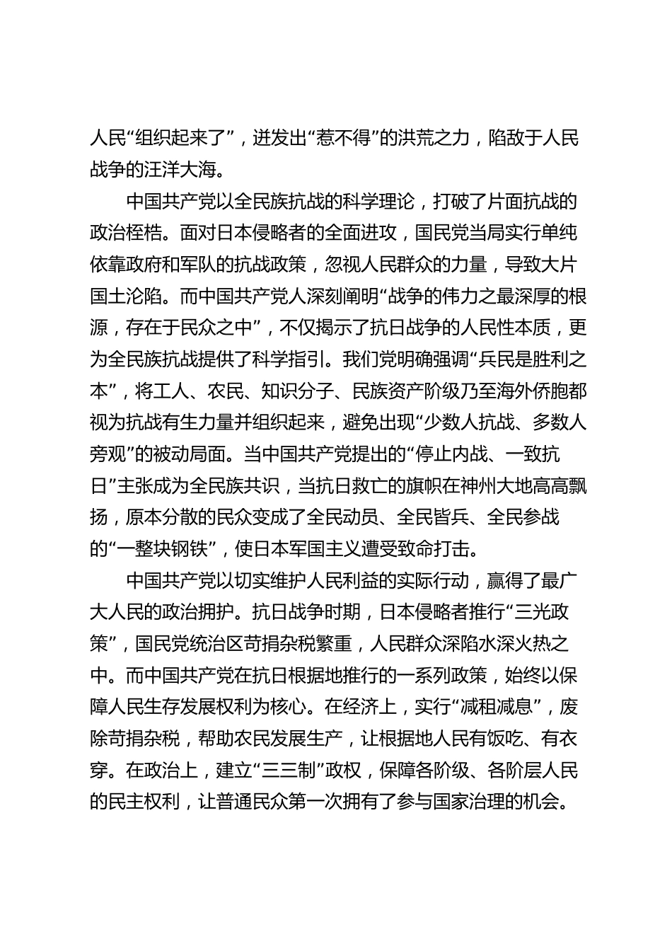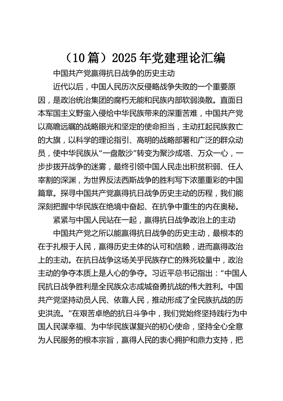 (10篇)2025年黨建理論匯編中國共產(chǎn)黨贏得抗日戰(zhàn)爭的歷史主動近代以后,中國人民歷次反侵略戰(zhàn)爭失敗的一個重要原因,是政治統(tǒng)治集團的腐朽無能和民族內(nèi)部軟弱渙散。直面日本軍國主義野蠻入侵給中華民族帶來的深重苦難,中國共產(chǎn)黨以高瞻遠矚的戰(zhàn)略眼光和堅定的使命擔(dān)當(dāng),主動扛起民族救亡的大旗,以科學(xué)的理論指引、高明的戰(zhàn)略部署和廣泛的群眾動“”員,使中華民族從一盤散沙轉(zhuǎn)變?yōu)榫凵吵伤?、萬眾一心,一步步撥開戰(zhàn)爭的迷霧,最終引領(lǐng)中國人民走出積貧積弱、任人宰割的深淵,為世界反法西斯戰(zhàn)爭的勝利寫下濃墨重彩的中國篇章。探尋中國共產(chǎn)黨贏得抗日戰(zhàn)爭歷史主動的歷...