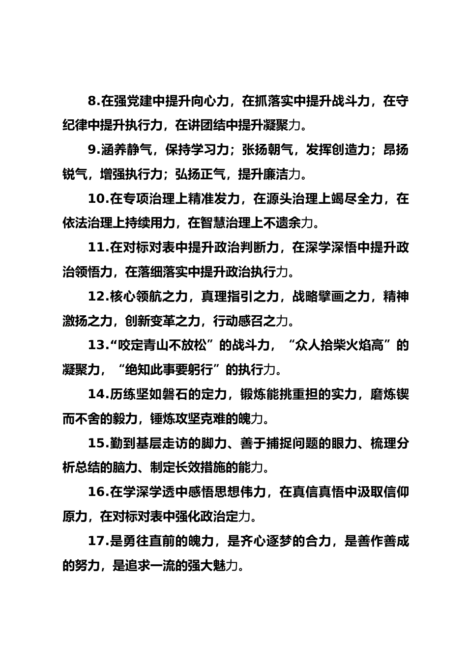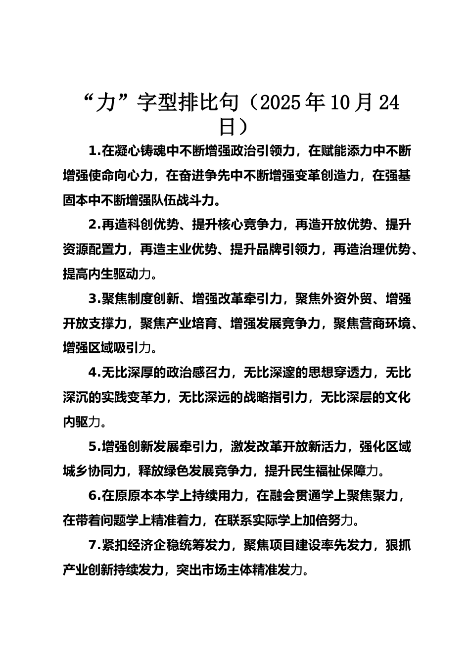 “力”字型排比句(2025年10月24日)1.在凝心鑄魂中不斷增強(qiáng)政治引領(lǐng)力,在賦能添力中不斷增強(qiáng)使命向心力,在奮進(jìn)爭先中不斷增強(qiáng)變革創(chuàng)造力,在強(qiáng)基固本中不斷增強(qiáng)隊伍戰(zhàn)斗力。2.再造科創(chuàng)優(yōu)勢、提升核心競爭力,再造開放優(yōu)勢、提升資源配置力,再造主業(yè)優(yōu)勢、提升品牌引領(lǐng)力,再造治理優(yōu)勢、提高內(nèi)生驅(qū)動力。3.聚焦制度創(chuàng)新、增強(qiáng)改革牽引力,聚焦外資外貿(mào)、增強(qiáng)開放支撐力,聚焦產(chǎn)業(yè)培育、增強(qiáng)發(fā)展競爭力,聚焦?fàn)I商環(huán)境、增強(qiáng)區(qū)域吸引力。4.無比深厚的政治感召力,無比深邃的思想穿透力,無比深沉的實踐變革力,無比深遠(yuǎn)的戰(zhàn)略指引力,無比深層的文化內(nèi)驅(qū)力。5.增強(qiáng)創(chuàng)新...