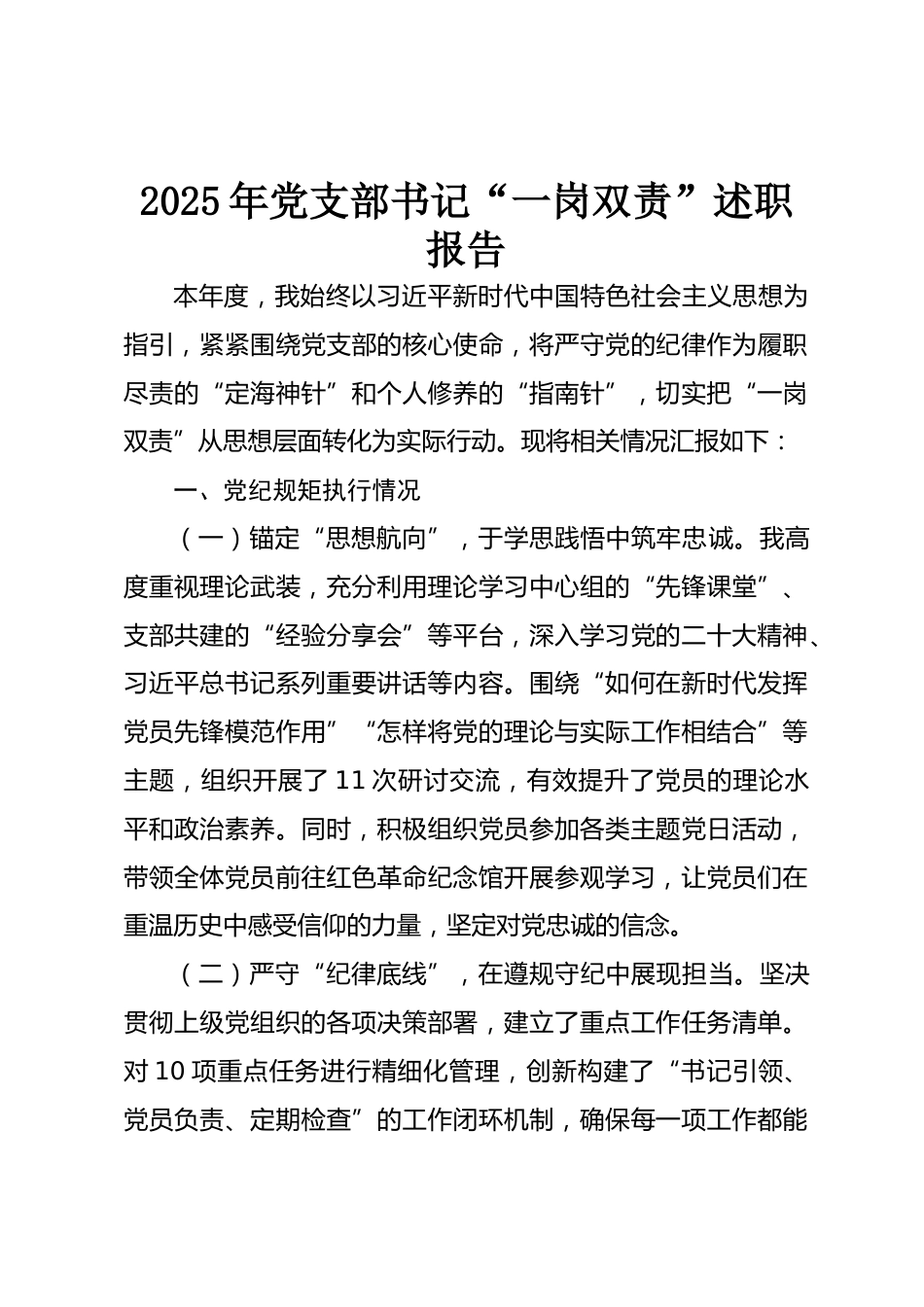 2025年黨支部書記“一崗雙責”述職報告本年度,我始終以習近平新時代中國特色社會主義思想為指引,緊緊圍繞黨支部的核心使命,將嚴守黨的紀律作為履職盡責的“定海神針”和個人修養(yǎng)的“指南針”,切實把“一崗雙責”從思想層面轉化為實際行動。現將相關情況匯報如下:一、黨紀規(guī)矩執(zhí)行情況(一)錨定“思想航向”,于學思踐悟中筑牢忠誠。我高度重視理論武裝,充分利用理論學習中心組的“先鋒課堂”、支部共建的“經驗分享會”等平臺,深入學習黨的二十大精神、習近平總書記系列重要講話等內容。圍繞“如何在新時代發(fā)揮黨員先鋒模范作用”“怎樣將黨的理論與實際工作相結...