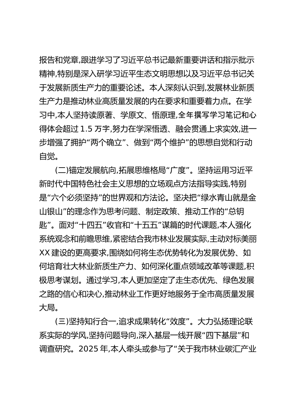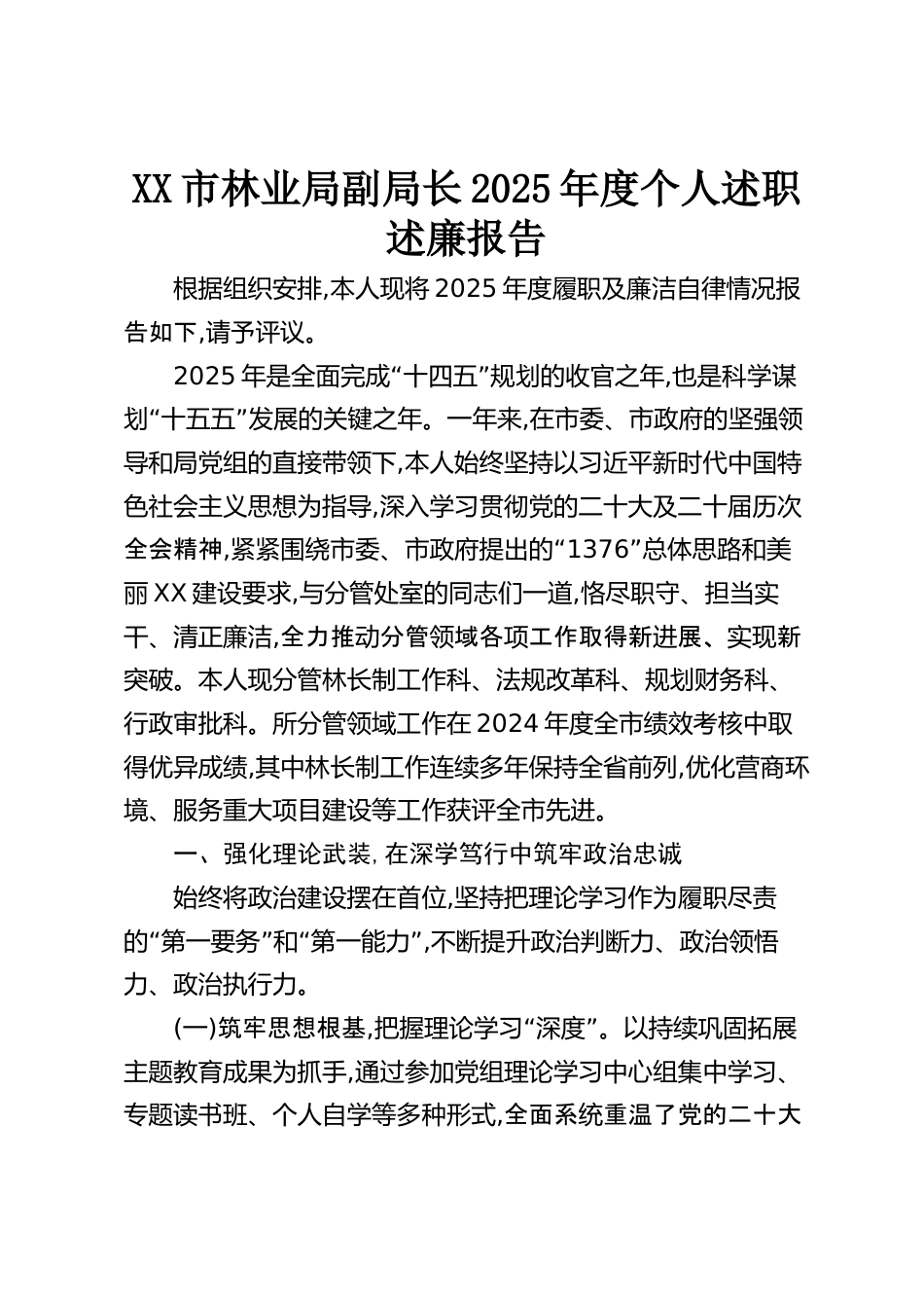XX市林業(yè)局副局長2025年度個人述職述廉報告根據(jù)組織安排,本人現(xiàn)將2025年度履職及廉潔自律情況報告如下,請予評議。2025“”年是全面完成十四五規(guī)劃的收官之年,也是科學謀“”劃十五五發(fā)展的關鍵之年。一年來,在市委、市政府的堅強領導和局黨組的直接帶領下,本人始終堅持以習近平新時代中國特色社會主義思想為指導,深入學習貫徹黨的二十大及二十屆歷次全會精神,“緊緊圍繞市委、市政府提出的1376”總體思路和美麗XX建設要求,與分管處室的同志們一道,恪盡職守、擔當實干、清正廉潔,全力推分管域各工作取得新展、新動領項進實現(xiàn)突破。本人現(xiàn)分管林長制工作科、法規(guī)改革科、規(guī)...