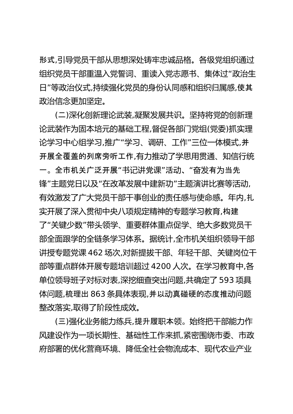 XX市直屬機(jī)關(guān)工作委員會(huì)2025年度機(jī)關(guān)黨建工作情況報(bào)告2025年以來(lái),XX市直屬機(jī)關(guān)各級(jí)黨組織深入貫徹落實(shí)國(guó)家最高領(lǐng)導(dǎo)人系列重要講話和重要指示精神,以高量展主質(zhì)發(fā)為題,以黨的政治建設(shè)為根本統(tǒng)領(lǐng),以全面從治黨主體任核壓實(shí)嚴(yán)責(zé)為心牽引,以建基斗堡基強(qiáng)層戰(zhàn)壘為堅(jiān)實(shí)礎(chǔ),以推黨建與工作動(dòng)業(yè)務(wù)深度融合為關(guān)鍵重點(diǎn),守正創(chuàng)新、真抓實(shí)干,推動(dòng)機(jī)關(guān)黨的建設(shè)各項(xiàng)工作取得顯著成效,為XX市經(jīng)濟(jì)社會(huì)高質(zhì)量發(fā)展提供了堅(jiān)強(qiáng)有力的政治引領(lǐng)和組織保證。一、強(qiáng)化政治建設(shè)統(tǒng)領(lǐng),筑牢絕對(duì)忠誠(chéng)的思想根基全市直屬機(jī)關(guān)始終將黨的政治建設(shè)擺在首位,教育引導(dǎo)廣大“”黨員干部深刻領(lǐng)悟兩個(gè)確立的決定...