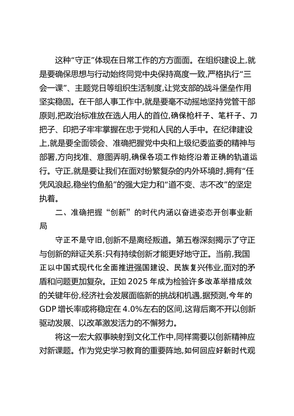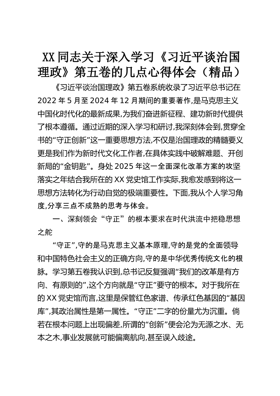 XX同志關(guān)于深入學(xué)習(xí)《習(xí)近平談治國理政》第五卷的幾點(diǎn)心得體會(huì)(精品)《習(xí)近平談治國理政》第五卷系統(tǒng)收錄了習(xí)近平總書記在2022年5月至2024年12月期間的重要著作,是馬克思主義中國化時(shí)代化的最新成果,為我們奮進(jìn)新征程、建功新時(shí)代提供了根本遵循。通過近期的深入學(xué)習(xí)和研討,我深刻體會(huì)到,貫穿全“”書的守正創(chuàng)新這一重要思想方法,不僅是治國理政的精髓要義更是我們作為新時(shí)代文化工作者,在具體實(shí)踐中破解難題、開創(chuàng)“”新局的金鑰匙。身處2025年這一全面深化改革方案的攻堅(jiān)落實(shí)之年結(jié)合我所在的XX黨史館工作實(shí)際,我愈發(fā)感到將這一思想方法轉(zhuǎn)化為行動(dòng)自覺的極端重要性。...