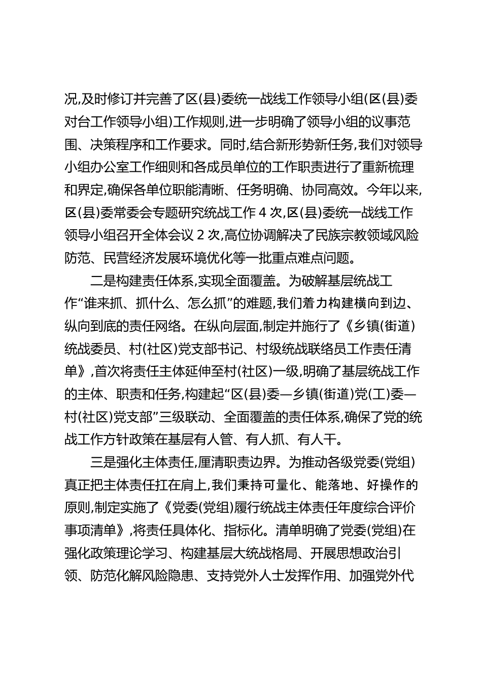 XX縣(區(qū))委關(guān)于落實(shí)統(tǒng)戰(zhàn)工作責(zé)任制情況的自查報(bào)告(精品)市委統(tǒng)一戰(zhàn)線工作領(lǐng)導(dǎo)小組:根據(jù)市委關(guān)于開(kāi)展統(tǒng)戰(zhàn)工作責(zé)任制落實(shí)情況專項(xiàng)督查的通知要求,我區(qū)(縣)黨委高度重視,立即組織力量,對(duì)照《中國(guó)共產(chǎn)黨統(tǒng)一戰(zhàn)線工作條例》和省委、市委相關(guān)文件精神,對(duì)2025年度以來(lái)我區(qū)(縣)貫徹落實(shí)統(tǒng)戰(zhàn)工作責(zé)任制情況進(jìn)行了全面、深入的自查?,F(xiàn)將有關(guān)情況報(bào)告如下。一、主要工作及成效2025年以來(lái),XX區(qū)(縣)委堅(jiān)持以習(xí)近平新時(shí)代中國(guó)特色社會(huì)主義思想為指導(dǎo),深入學(xué)習(xí)貫徹習(xí)近平總書(shū)記關(guān)于做好新時(shí)代黨的統(tǒng)一戰(zhàn)線工作的重要思想,堅(jiān)決落實(shí)中央和省委、市委關(guān)于統(tǒng)一戰(zhàn)線的重大決策部署,牢牢把...