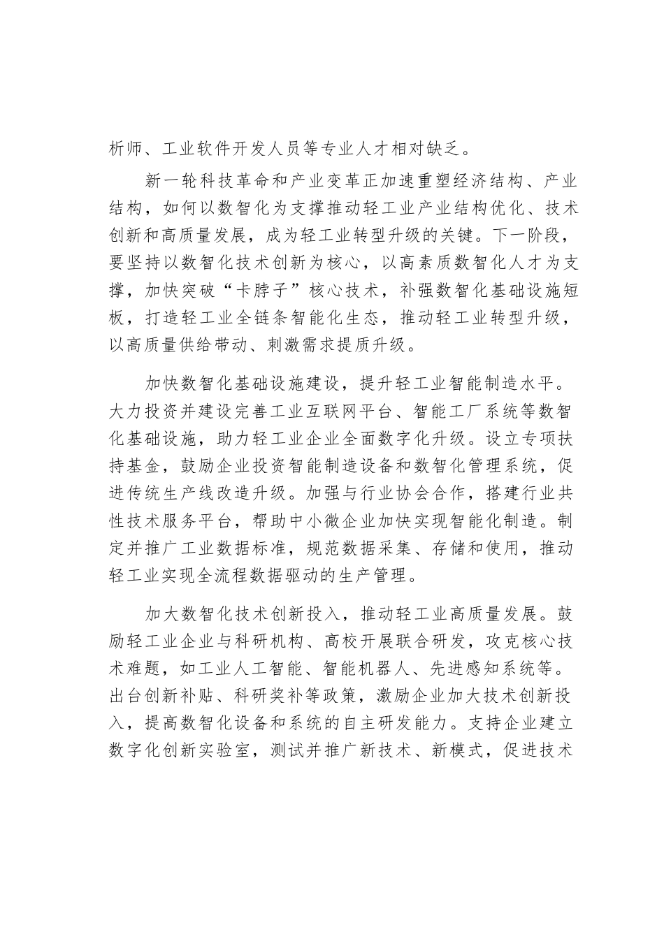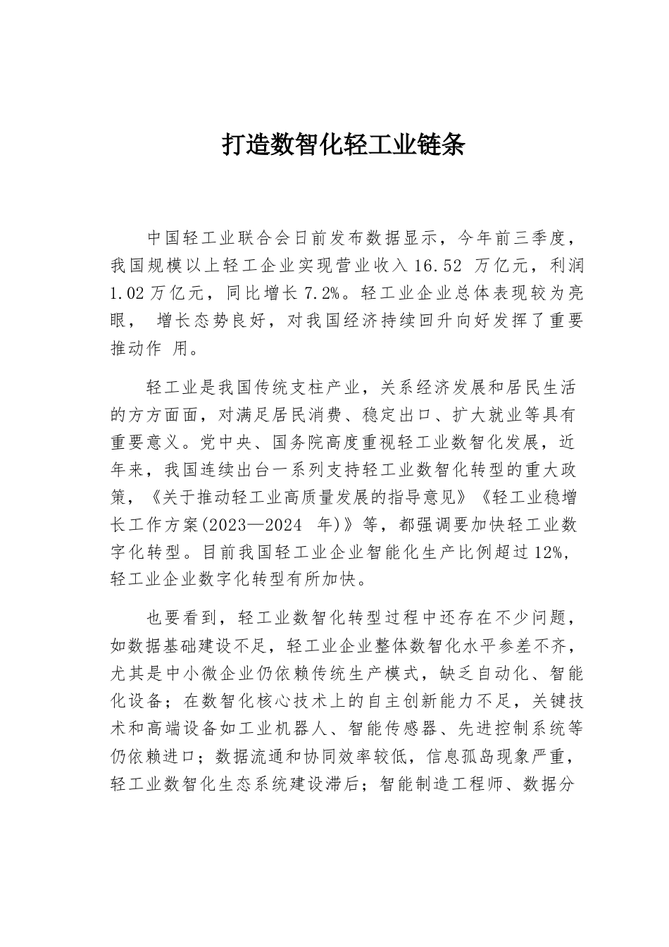 打造數(shù)智化輕工業(yè)鏈條中國輕工業(yè)聯(lián)合會日前發(fā)布數(shù)據(jù)顯示,今年前三季度,我國規(guī)模以上輕工企業(yè)實現(xiàn)營業(yè)收入16.52萬億元,利潤1.02萬億元,同比增長7.2%。輕工業(yè)企業(yè)總體表現(xiàn)較為亮眼,增長態(tài)勢良好,對我國經(jīng)濟持續(xù)回升向好發(fā)揮了重要推動作用。輕工業(yè)是我國傳統(tǒng)支柱產(chǎn)業(yè),關(guān)系經(jīng)濟發(fā)展和居民生活的方方面面,對滿足居民消費、穩(wěn)定出口、擴大就業(yè)等具有重要意義。黨中央、國務(wù)院高度重視輕工業(yè)數(shù)智化發(fā)展,近年來,我國連續(xù)出臺一系列支持輕工業(yè)數(shù)智化轉(zhuǎn)型的重大政策,《關(guān)于推動輕工業(yè)高質(zhì)量發(fā)展的指導(dǎo)意見》《輕工業(yè)穩(wěn)增長工作方案(2023—2024年)》等,都強調(diào)要加快輕...
