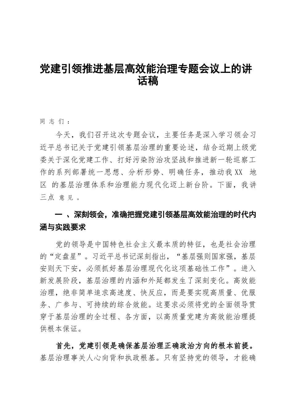 黨建引領(lǐng)推進基層高效能治理專題會議上的講話稿同志們:今天,我們召開這次專題會議,主要任務(wù)是深入學(xué)習領(lǐng)會習近平總書記關(guān)于黨建引領(lǐng)基層治理的重要論述,結(jié)合近期上級黨委關(guān)于深化黨建工作、打好污染防治攻堅戰(zhàn)和推進新一輪巡察工作的系列部署統(tǒng)一思想、分析形勢、明確任務(wù),推動我XX地區(qū)的基層治理體系和治理能力現(xiàn)代化邁上新臺階。下面,我講三點意見。一、深刻領(lǐng)會,準確把握黨建引領(lǐng)基層高效能治理的時代內(nèi)涵與實踐要求黨的領(lǐng)導(dǎo)是中國特色社會主義最本質(zhì)的特征,也是社會治理的“定盤星”。習近平總書記深刻指出,“基層強則國家強,基層安則天下安,必須抓好基層...
