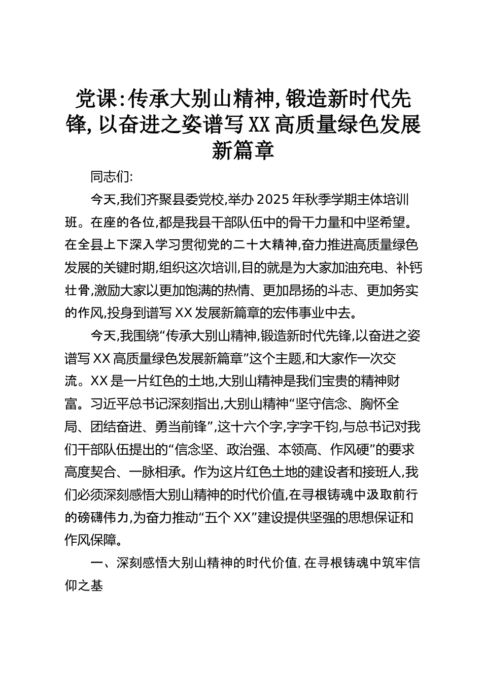 黨課:傳承大別山精神,鍛造新時代先鋒,以奮進(jìn)之姿譜寫XX高質(zhì)量綠色發(fā)展新篇章同志們:今天,我們齊聚縣委黨校,舉辦2025年秋季學(xué)期主體培訓(xùn)班。在座的各位,都是我縣干部隊伍中的骨干力量和中堅希望。在全上下深入學(xué)黨的二十大精神縣習(xí)貫徹,奮力推進(jìn)高質(zhì)量綠色發(fā)展的關(guān)鍵時期,組織這次培訓(xùn),目的就是為大家加油充電、補(bǔ)鈣壯骨,激勵大家以更加飽滿的熱情、更加昂揚(yáng)的斗志、更加務(wù)實的作風(fēng),投身到譜寫XX發(fā)展新篇章的宏偉事業(yè)中去。今天,“我圍繞傳承大別山精神,鍛造新時代先鋒,以奮進(jìn)之姿譜寫XX”高質(zhì)量綠色發(fā)展新篇章這個主題,和大家作一次交流。XX是一片紅色的土地,大別山精神...