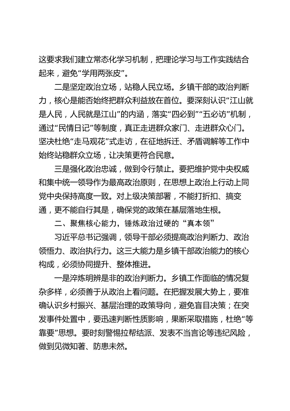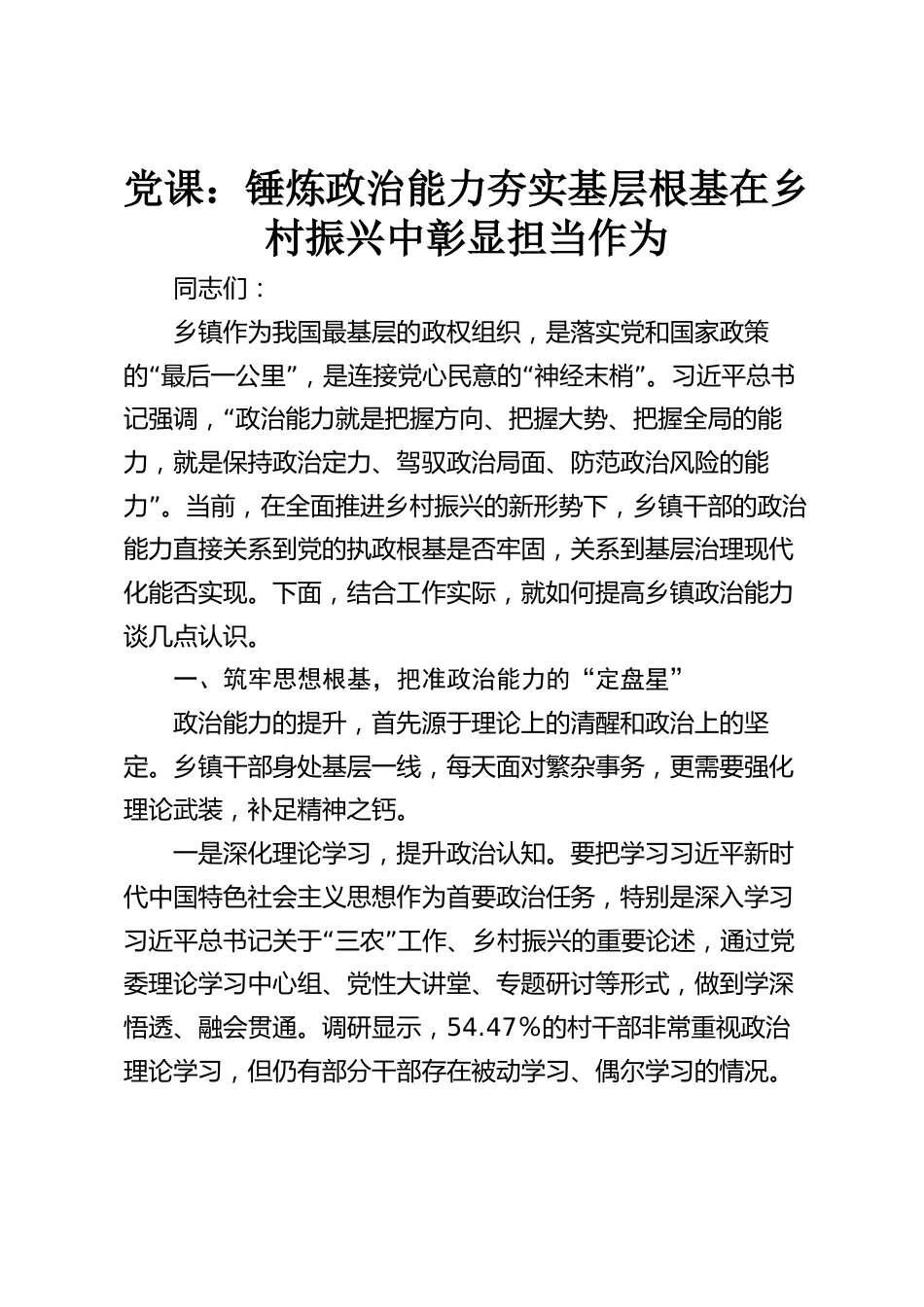 黨課:錘煉政治能力夯實基層根基在鄉(xiāng)村振興中彰顯擔當作為同志們:鄉(xiāng)鎮(zhèn)作為我國最基層的政權(quán)組織,是落實黨和國家政策“”“”的最后一公里,是連接黨心民意的神經(jīng)末梢。習近平總書“記強調(diào),政治能力就是把握方向、把握大勢、把握全局的能力,就是保持政治定力、駕馭政治局面、防范政治風險的能”力。當前,在全面推進鄉(xiāng)村振興的新形勢下,鄉(xiāng)鎮(zhèn)干部的政治能力直接關(guān)系到黨的執(zhí)政根基是否牢固,關(guān)系到基層治理現(xiàn)代化能否實現(xiàn)。下面,結(jié)合工作實際,就如何提高鄉(xiāng)鎮(zhèn)政治能力談幾點認識。一、筑牢思想根基,把準政治能力的“定盤星”政治能力的提升,首先源于理論上的清醒和...