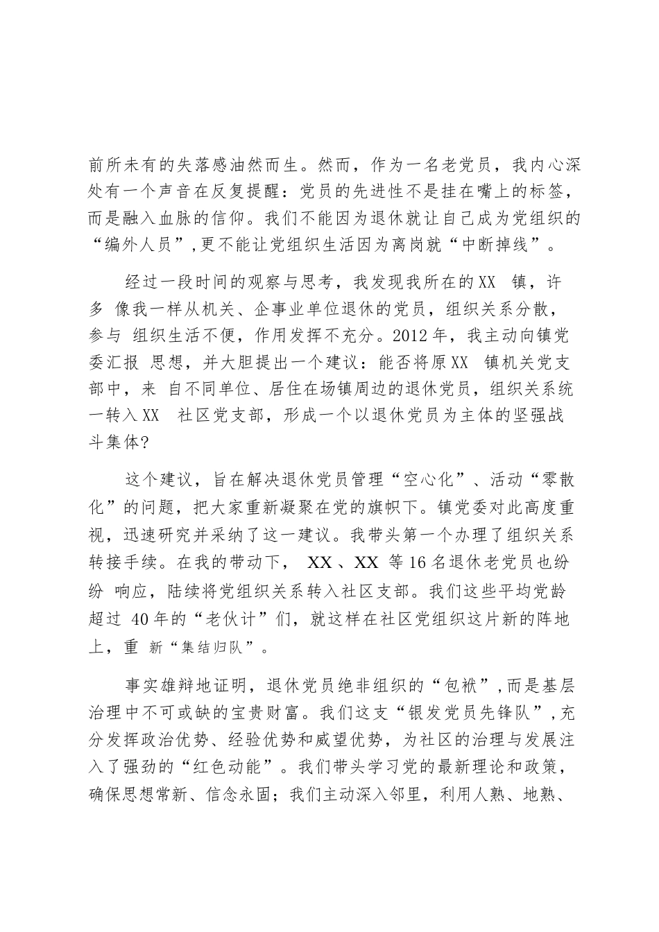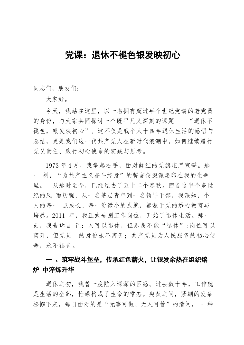 黨課:退休不褪色銀發(fā)映初心同志們,朋友們:大家好。今天,我站在這里,以一名擁有超過半個世紀黨齡的老黨員的身份,與大家共同探討一個既平凡又深刻的課題——“退休不褪色,銀發(fā)映初心”。這不僅是我個人十四年退休生活的感悟與總結,更是我們這一代共產(chǎn)黨人在新時代浪潮中,如何繼續(xù)履行黨員責任、踐行初心使命的實踐與思考。1973年4月,我舉起右手,面對鮮紅的黨旗莊嚴宣誓。那一刻,“為共產(chǎn)主義奮斗終身”的誓言便深深烙印在我的生命里。從那時至今,已經(jīng)過去了五十二個春秋?;厥走@半個多世紀的風雨歷程,從一名基層青年到一名領導干部,我深知,個人的每一點成...