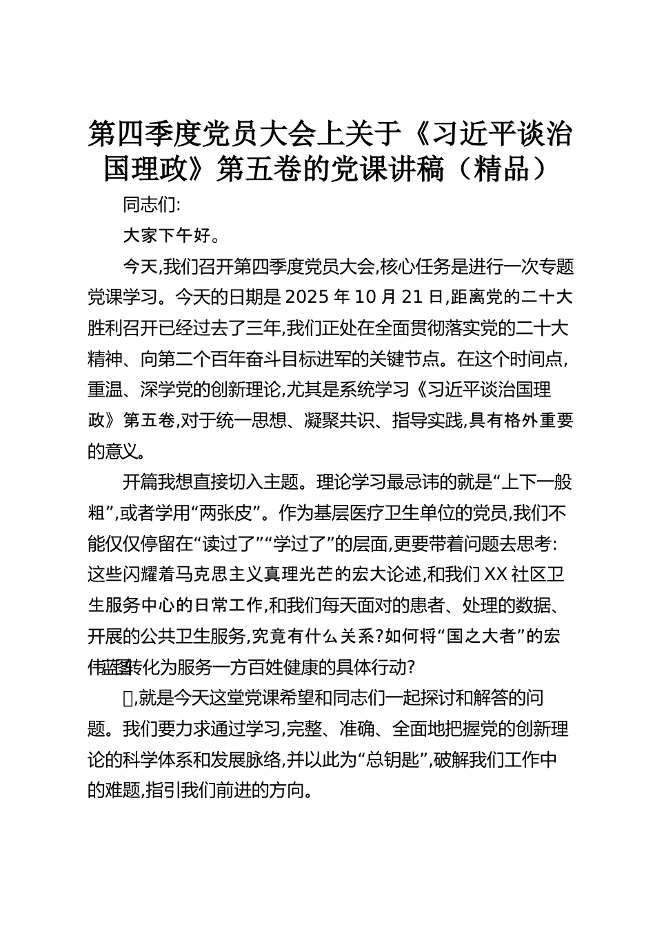 第四季度黨員大會(huì)上關(guān)于《習(xí)近平談治國(guó)理政》第五卷的黨課講稿(精品)同志們:大家下午好。今天,我們召開第四季度黨員大會(huì),核心任務(wù)是進(jìn)行一次專題黨課學(xué)習(xí)。今天的日期是2025年10月21日,距離黨的二十大勝利召開已經(jīng)過(guò)去了三年,我們正處在全面貫徹落實(shí)黨的二十大精神、向第二個(gè)百年奮斗目標(biāo)進(jìn)軍的關(guān)鍵節(jié)點(diǎn)。在這個(gè)時(shí)間點(diǎn),重溫、深學(xué)黨的創(chuàng)新理論,尤其是系統(tǒng)學(xué)習(xí)《習(xí)近平談治國(guó)理政》第五卷,對(duì)于統(tǒng)一思想、凝聚共識(shí)、指導(dǎo)實(shí)踐,具有格外重要的意義?!伴_篇我想直接切入主題。理論學(xué)習(xí)最忌諱的就是上下一般”粗,“”或者學(xué)用兩張皮。作為基層醫(yī)療衛(wèi)生單位的黨員,我們不“”...