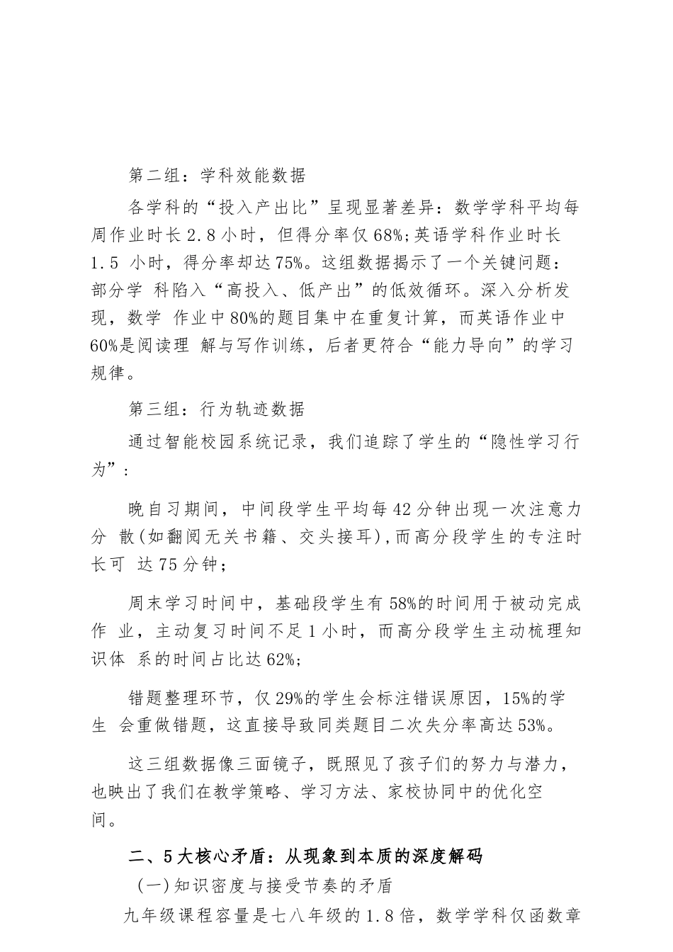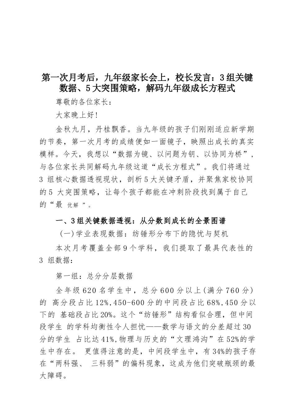 第一次月考后,九年級(jí)家長(zhǎng)會(huì)上,校長(zhǎng)發(fā)言:3組關(guān)鍵數(shù)據(jù)、5大突圍策略,解碼九年級(jí)成長(zhǎng)方程式尊敬的各位家長(zhǎng):大家晚上好!金秋九月,丹桂飄香。當(dāng)九年級(jí)的孩子們剛剛適應(yīng)新學(xué)期的節(jié)奏,第一次月考的成績(jī)便如一面鏡子,映照出成長(zhǎng)的真實(shí)模樣。今天,我想以“數(shù)據(jù)為鏡、以問(wèn)題為鑰、以協(xié)同為橋”,與各位家長(zhǎng)共同解碼九年級(jí)這道“成長(zhǎng)方程式”。我們將通過(guò)3組核心數(shù)據(jù)透視現(xiàn)狀,剖析5大關(guān)鍵矛盾,并聚焦家校協(xié)同的5大突圍策略,讓每個(gè)孩子都能在沖刺階段找到屬于自己的“最優(yōu)解”。一、3組關(guān)鍵數(shù)據(jù)透視:從分?jǐn)?shù)到成長(zhǎng)的全景圖譜(一)學(xué)業(yè)表現(xiàn)數(shù)據(jù):紡錘形分布下的隱憂(yōu)與契機(jī)本...