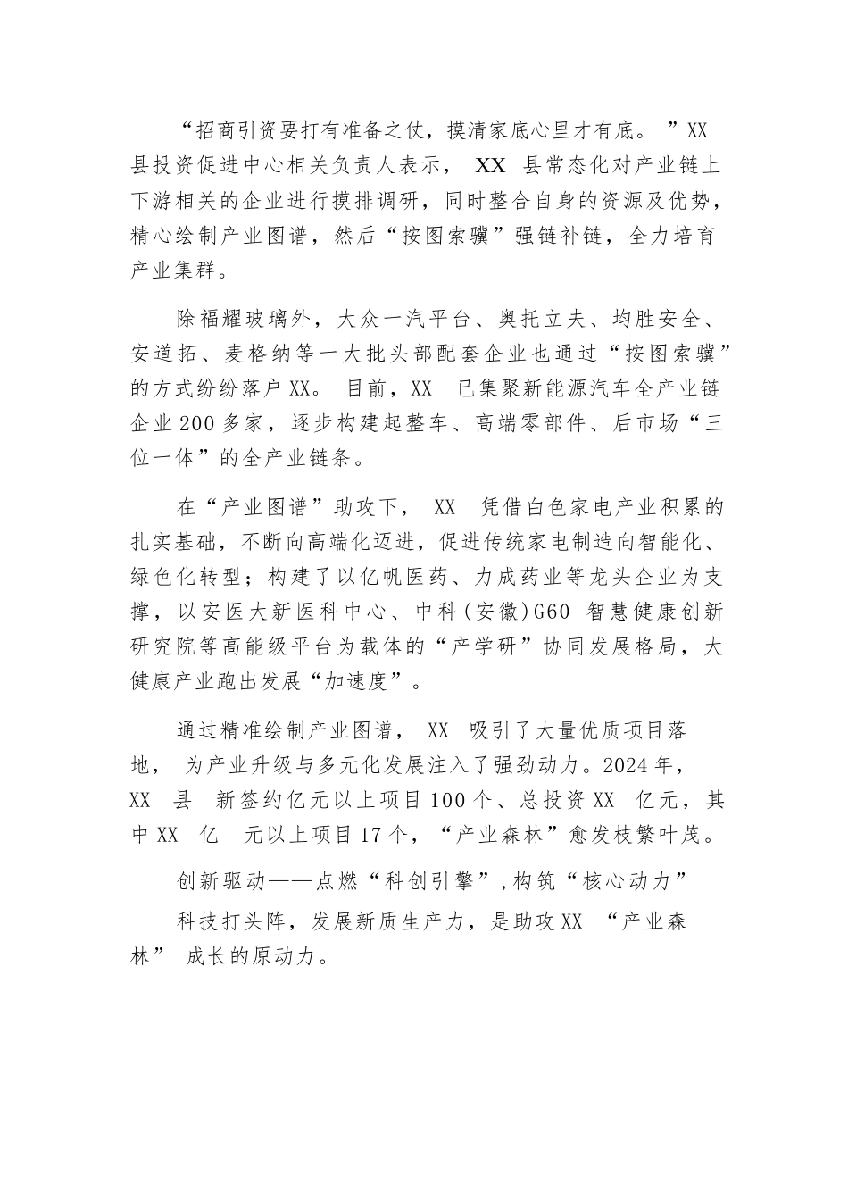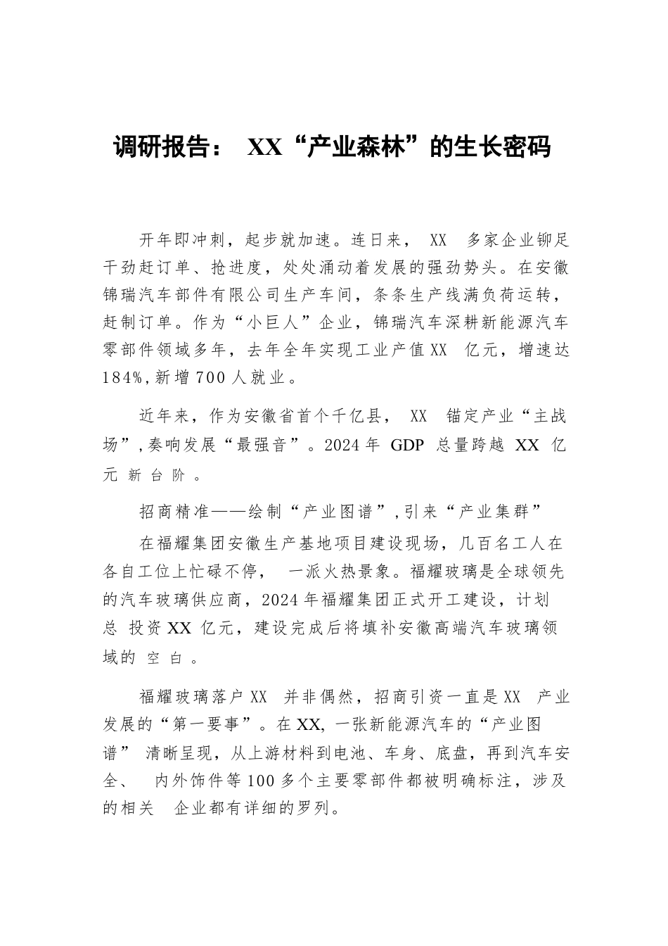 調研報告:XX“產業(yè)森林”的生長密碼開年即沖刺,起步就加速。連日來,XX多家企業(yè)鉚足干勁趕訂單、搶進度,處處涌動著發(fā)展的強勁勢頭。在安徽錦瑞汽車部件有限公司生產車間,條條生產線滿負荷運轉,趕制訂單。作為“小巨人”企業(yè),錦瑞汽車深耕新能源汽車零部件領域多年,去年全年實現(xiàn)工業(yè)產值XX億元,增速達184%,新增700人就業(yè)。近年來,作為安徽省首個千億縣,XX錨定產業(yè)“主戰(zhàn)場”,奏響發(fā)展“最強音”。2024年GDP總量跨越XX億元新臺階。招商精準——繪制“產業(yè)圖譜”,引來“產業(yè)集群”在福耀集團安徽生產基地項目建設現(xiàn)場,幾百名工人在各自工位上忙碌不停,一派火熱...