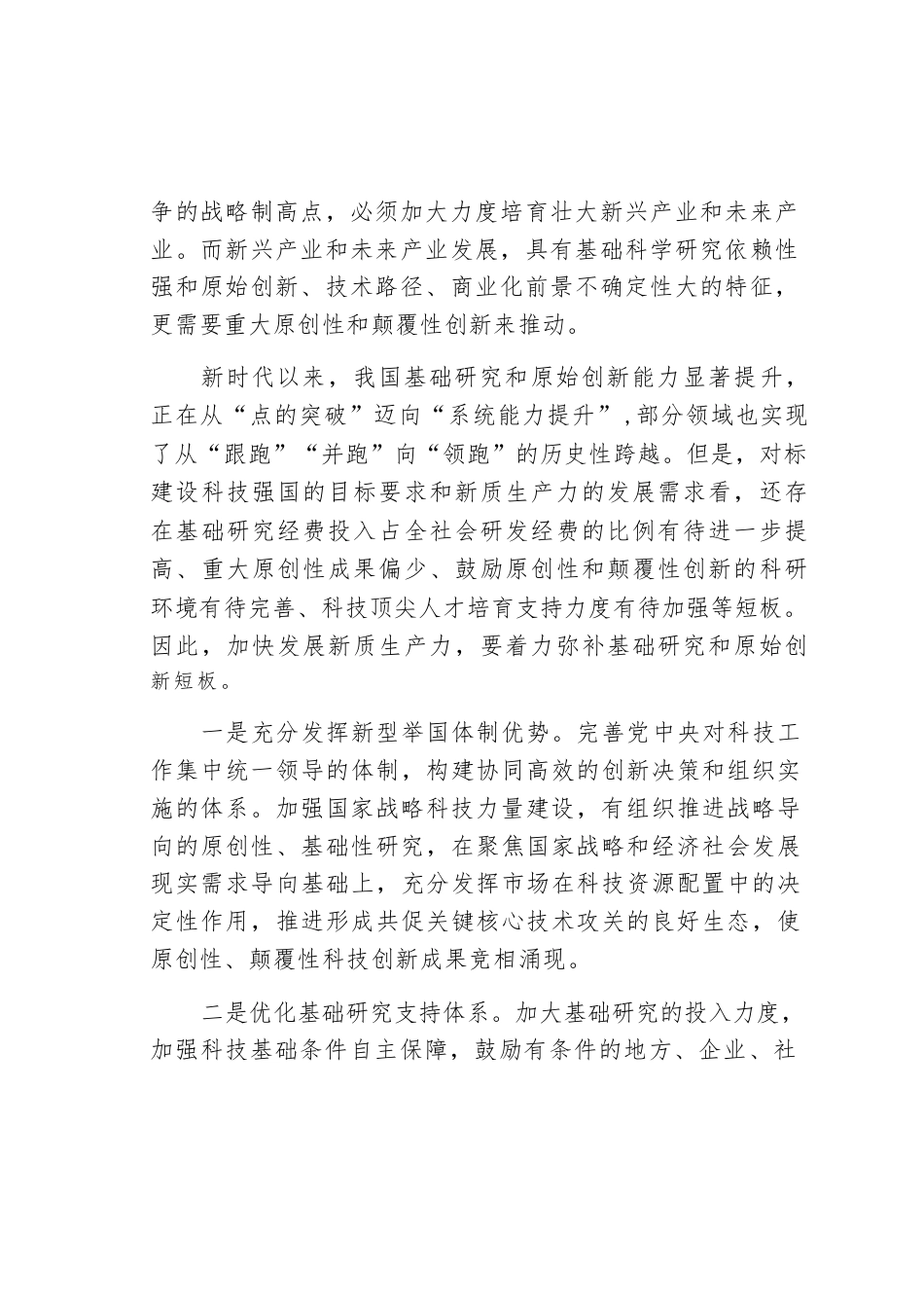 發(fā)展新質(zhì)生產(chǎn)力必須做好創(chuàng)新這篇大文章習近平總書記指出:“新質(zhì)生產(chǎn)力的顯著特點是創(chuàng)新,既包括技術和業(yè)態(tài)模式層面的創(chuàng)新,也包括管理和制度層面的創(chuàng)新。必須繼續(xù)做好創(chuàng)新這篇大文章,推動新質(zhì)生產(chǎn)力加快發(fā)展?!贝罅ν七M科技創(chuàng)新實現(xiàn)技術革命性突破、以技術創(chuàng)新推進產(chǎn)業(yè)創(chuàng)新實現(xiàn)產(chǎn)業(yè)深度轉(zhuǎn)型升級,從而大幅提升全要素生產(chǎn)率,這是新質(zhì)生產(chǎn)力發(fā)展的基本路徑??萍紕?chuàng)新和產(chǎn)業(yè)創(chuàng)新需要相應的體制機制創(chuàng)新,需要暢通教育、科技、人才的良性循環(huán),從而形成與新質(zhì)生產(chǎn)力發(fā)展更相適應的生產(chǎn)關系,為各類生產(chǎn)要素發(fā)展及優(yōu)化組合躍升創(chuàng)造更好的條件。提高基礎研究和原始創(chuàng)新能力...