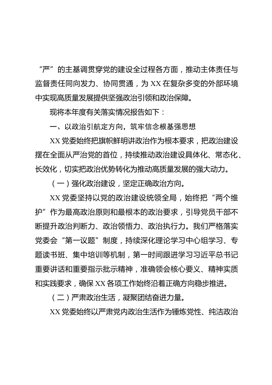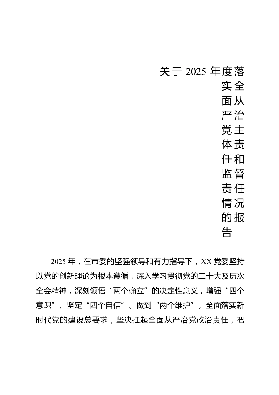 關(guān)于2025年度落實(shí)全面從嚴(yán)治黨主體責(zé)任和監(jiān)督責(zé)任情況的報(bào)告2025年,在市委的堅(jiān)強(qiáng)領(lǐng)導(dǎo)和有力指導(dǎo)下,XX黨委堅(jiān)持以黨的創(chuàng)新理論為根本遵循,深入學(xué)習(xí)貫徹黨的二十大及歷次全會(huì)精神,深刻領(lǐng)悟“兩個(gè)確立”的決定性意義,增強(qiáng)“四個(gè)意識(shí)”、堅(jiān)定“四個(gè)自信”、做到“兩個(gè)維護(hù)”。全面落實(shí)新時(shí)代黨的建設(shè)總要求,堅(jiān)決扛起全面從嚴(yán)治黨政治責(zé)任,把“嚴(yán)”的主基調(diào)貫穿黨的建設(shè)全過(guò)程各方面,推動(dòng)主體責(zé)任與監(jiān)督責(zé)任同向發(fā)力、協(xié)同貫通,為XX在復(fù)雜多變的外部環(huán)境中實(shí)現(xiàn)高質(zhì)量發(fā)展提供堅(jiān)強(qiáng)政治引領(lǐng)和政治保障?,F(xiàn)將本年度有關(guān)落實(shí)情況報(bào)告如下:一、以政治引航定方向,筑牢信念...