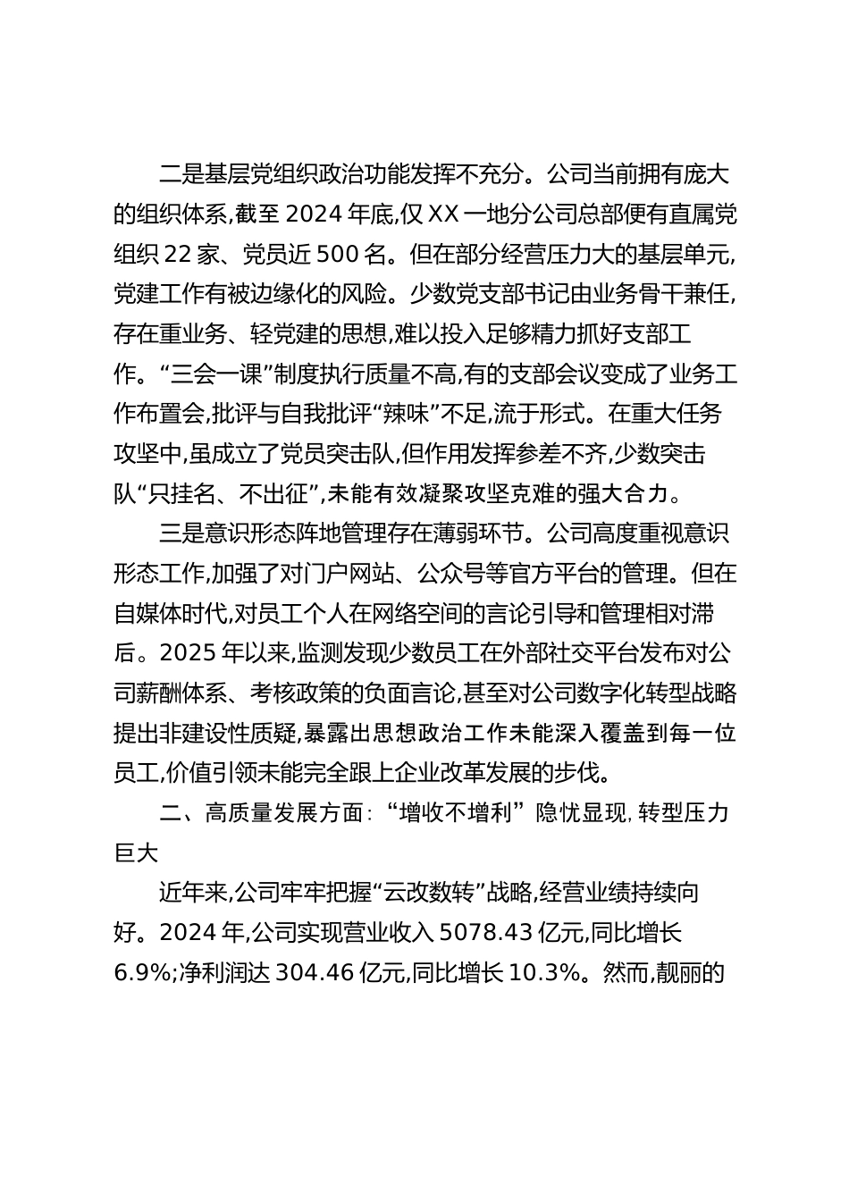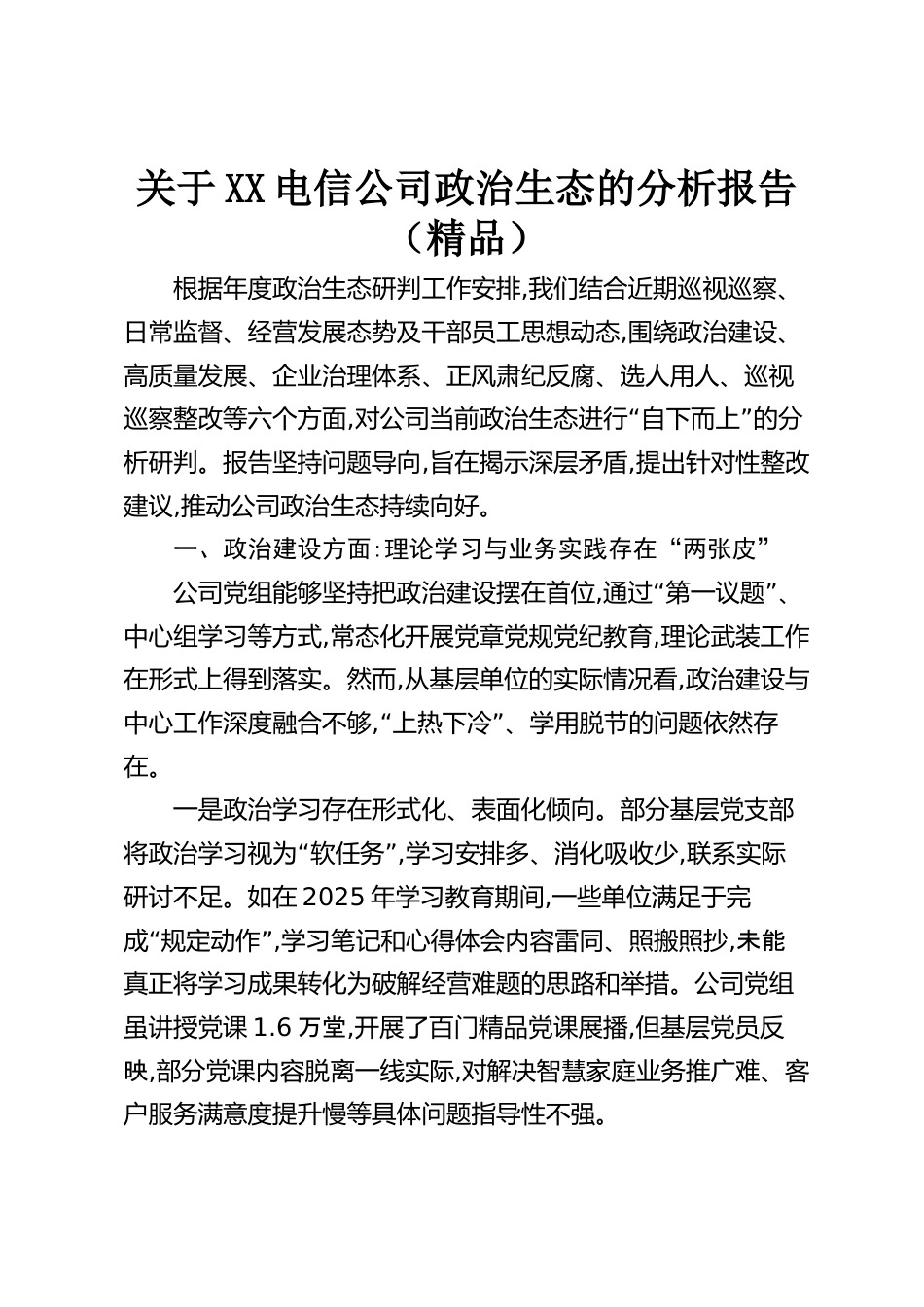 關于XX電信公司政治生態(tài)的分析報告(精品)根據(jù)年度政治生態(tài)研判工作安排,我們結合近期巡視巡察、日常監(jiān)督、經營發(fā)展態(tài)勢及干部員工思想動態(tài),圍繞政治建設、高質量發(fā)展、企業(yè)治理體系、正風肅紀反腐、選人用人、巡視巡察整改等六個方面,“”對公司當前政治生態(tài)進行自下而上的分析研判。報告堅持問題導向,旨在揭示深層矛盾,提出針對性整改建議,推動公司政治生態(tài)持續(xù)向好。一、政治建設方面:理論學習與業(yè)務實踐存在“兩張皮”公司黨組能夠堅持把政治建設擺在首位,“”通過第一議題、中心組學習等方式,常態(tài)化開展黨章黨規(guī)黨紀教育,理論武裝工作在形式上得到落實。然而,從基...