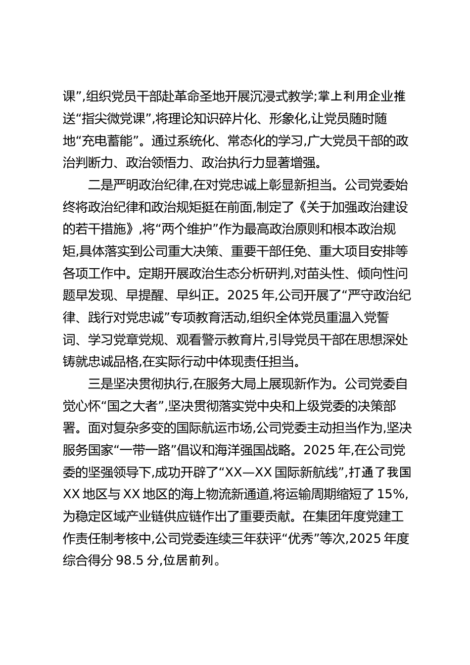 關(guān)于XX航運(yùn)集團(tuán)有限公司思想政治工作先進(jìn)單位的申報(bào)材料(精品)“”“”思想政治工作是國(guó)有企業(yè)的根和魂,“是企業(yè)發(fā)展的生”命線。近年來(lái),XX航運(yùn)集團(tuán)有限公司黨委堅(jiān)持以習(xí)近平新時(shí)代中國(guó)特色社會(huì)主義思想為指導(dǎo),深入學(xué)習(xí)貫徹黨的二十大精神和習(xí)近平總書(shū)記關(guān)于國(guó)有企業(yè)改革發(fā)展和黨的建設(shè)的重要論述,全面落實(shí)新時(shí)代黨的建設(shè)總要求,將思想政治工作貫穿于公司治理、改革發(fā)展和生產(chǎn)經(jīng)營(yíng)全過(guò)程,以高質(zhì)量黨建引領(lǐng)企業(yè)高質(zhì)量發(fā)展,取得了一系列扎實(shí)成效。一、堅(jiān)持政治引領(lǐng),筑牢絕對(duì)忠誠(chéng)的思想根基公司黨委始終把黨的政治建設(shè)擺在首位,教育引導(dǎo)全體黨員“”干部深刻領(lǐng)悟兩個(gè)確立...