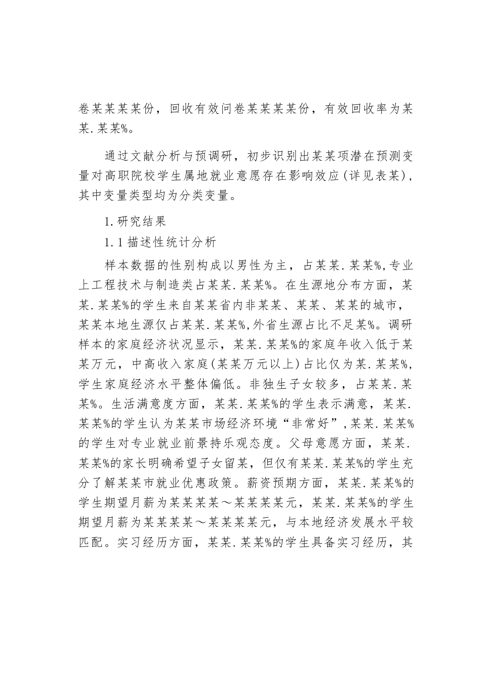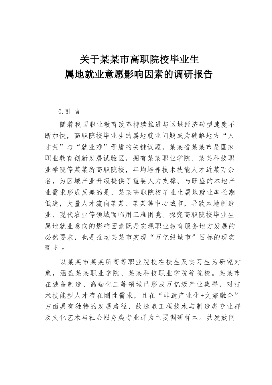 關(guān)于某某市高職院校畢業(yè)生屬地就業(yè)意愿影響因素的調(diào)研報(bào)告0.引言隨著我國(guó)職業(yè)教育改革持續(xù)推進(jìn)與區(qū)域經(jīng)濟(jì)轉(zhuǎn)型速度不斷加快,高職院校畢業(yè)生的屬地就業(yè)問(wèn)題成為破解地方“人才荒”與“就業(yè)難”矛盾的關(guān)鍵議題。某某省某某市是國(guó)家職業(yè)教育創(chuàng)新發(fā)展試驗(yàn)區(qū),擁有某某職業(yè)學(xué)院、某某科技職業(yè)學(xué)院等某某所高職院校,年均培養(yǎng)技術(shù)技能人才近某萬(wàn)余名,為區(qū)域產(chǎn)業(yè)升級(jí)提供了重要人力支撐。與旺盛的本地產(chǎn)業(yè)需求形成反差的是,某某高職院校畢業(yè)生屬地就業(yè)率長(zhǎng)期低迷,大量人才流向某某、某某等中心城市,導(dǎo)致本地制造業(yè)、現(xiàn)代農(nóng)業(yè)等領(lǐng)域面臨用工難困境。探究高職院校畢業(yè)生屬地就...