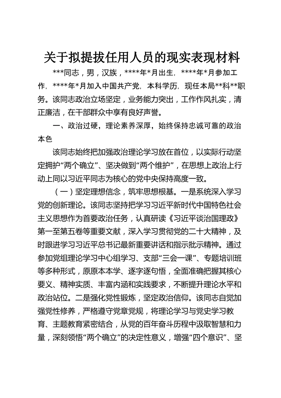 關(guān)于擬提拔任用人員的現(xiàn)實(shí)表現(xiàn)材料